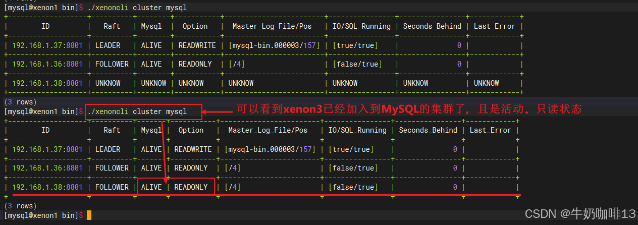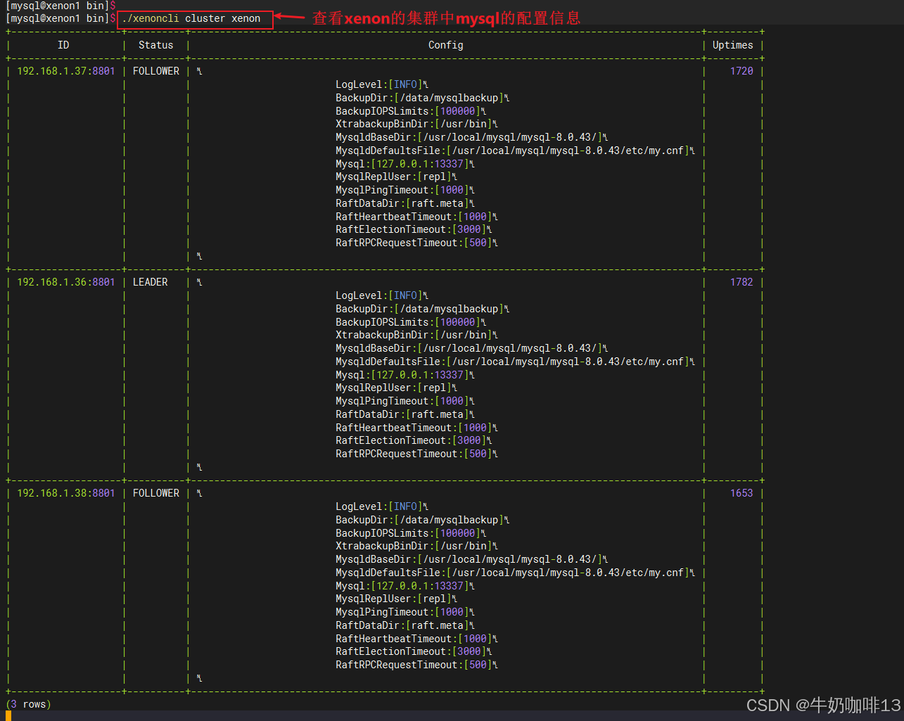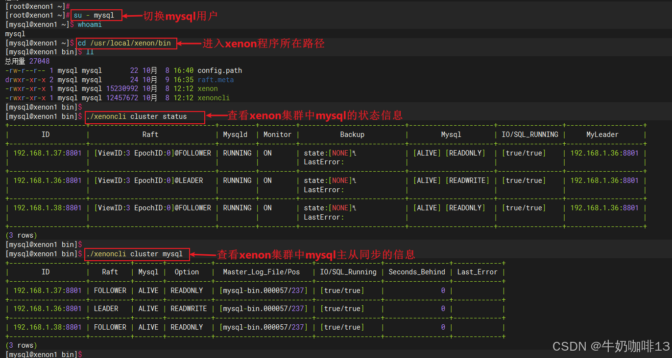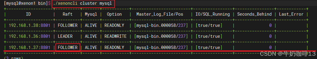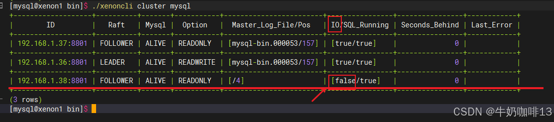 ./xenoncli cluster status#4-查看xenon集群中MySQL的主从复制状态信息