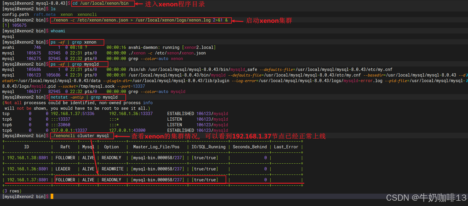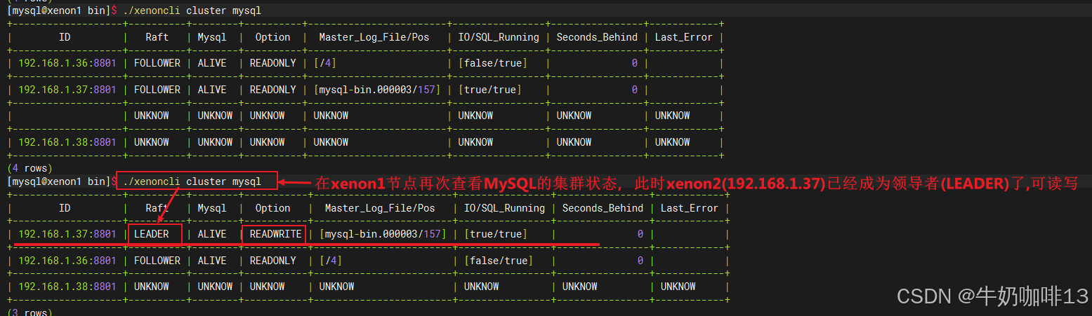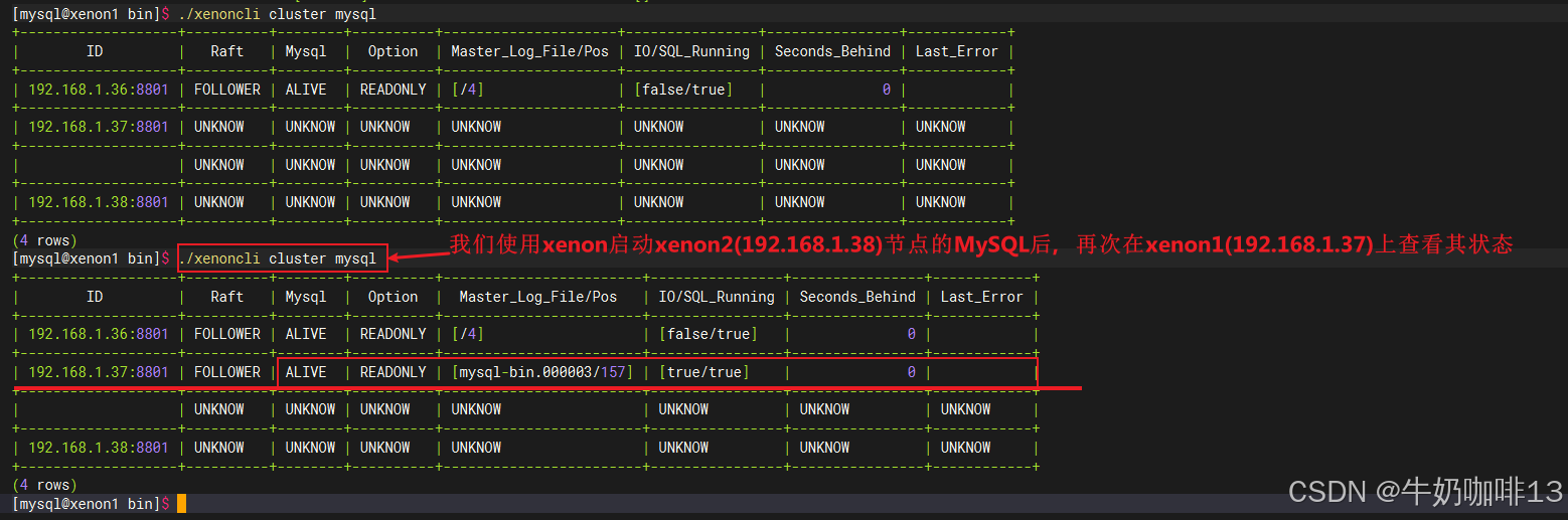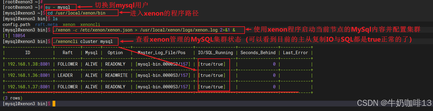 ./xenoncli cluster status#4-查看xenon集群中MySQL的主从复制状态信息