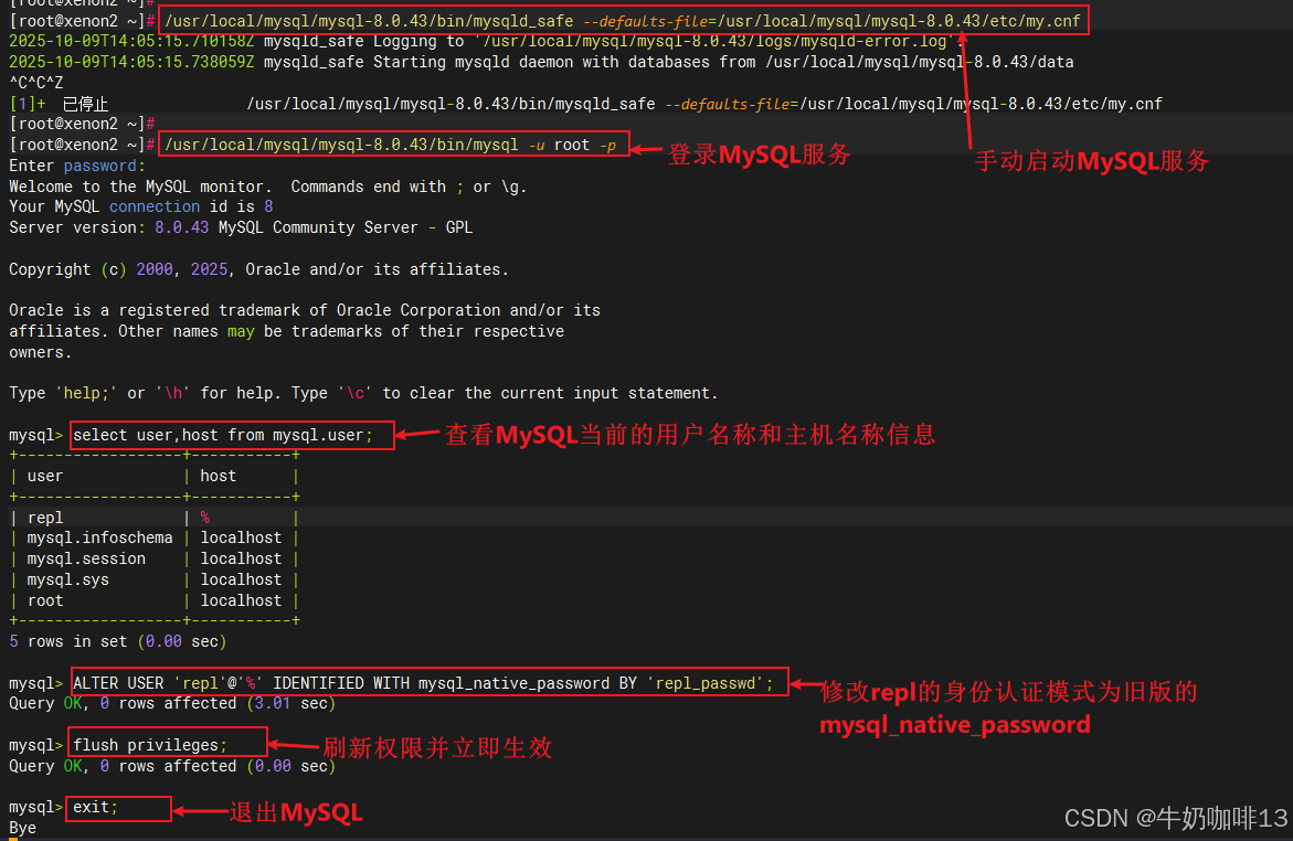 /usr/local/mysql/mysql-8.0.43/bin/mysqld_safe --defaults-file=/usr/local/mysql/mysql-8.0.43/etc/my.cnf#9-查看mysql的进程、网络端口内容(查看到对应的mysql进程与网络端口与我们配置的一致表示正常;确认正常后即可杀死该进程)