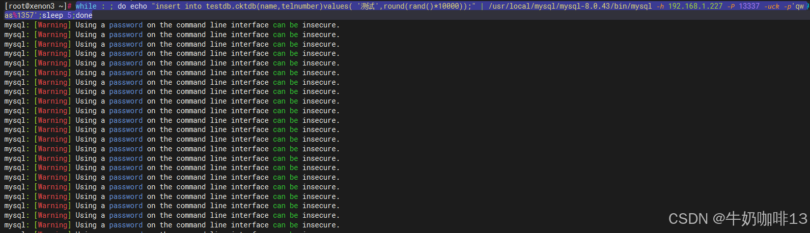 while : ; do echo "insert into testdb.cktdb(name,telnumber)values( '测试',round(rand()*10000));" | /usr/local/mysql/mysql-8.0.43/bin/mysql -h 192.168.1.227 -P 13337 -uck -p'qwas%1357';sleep 5;done