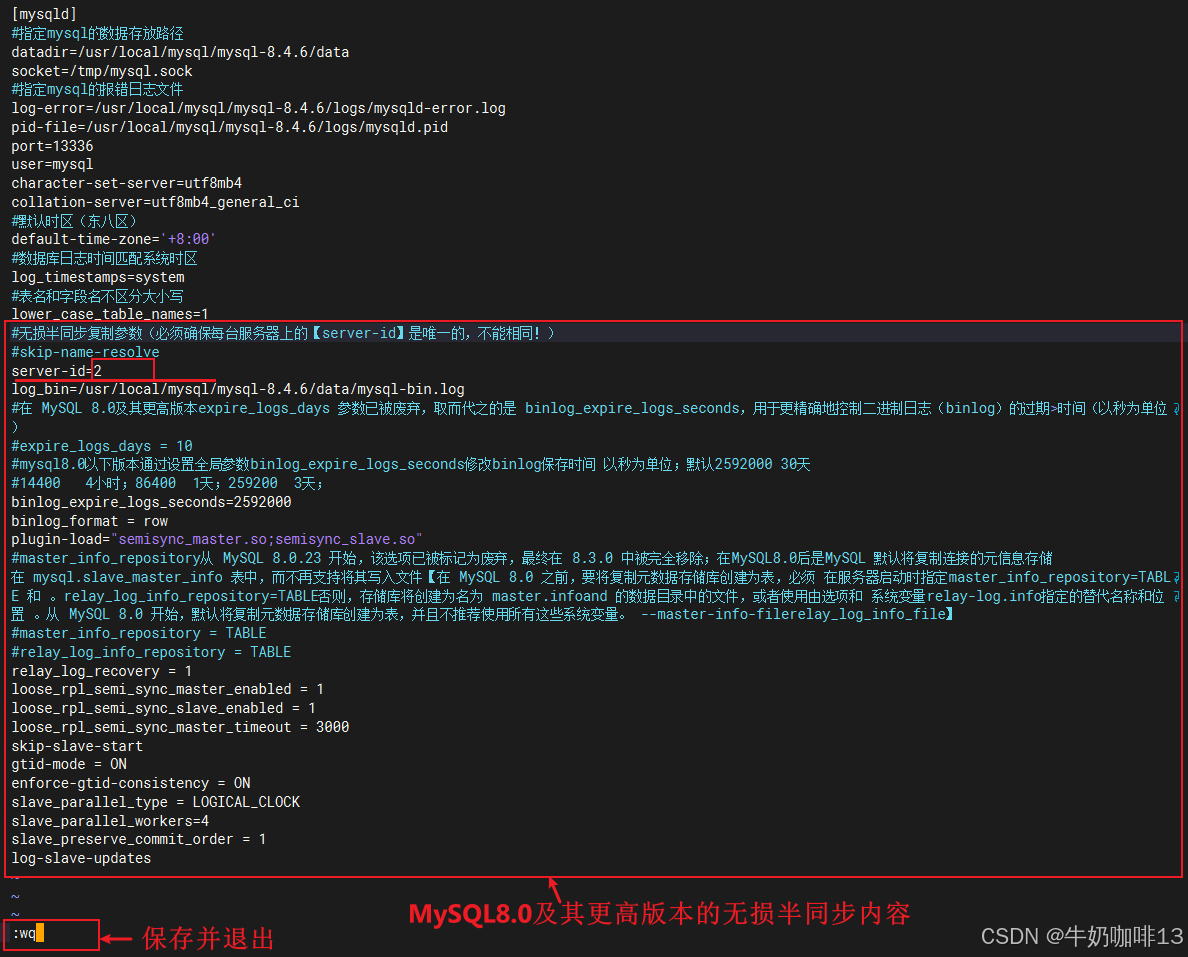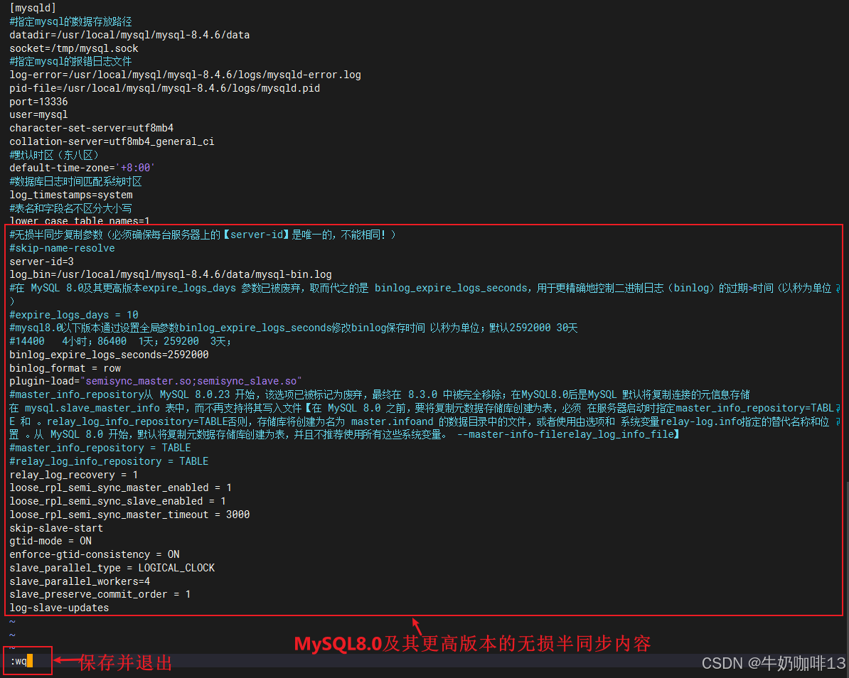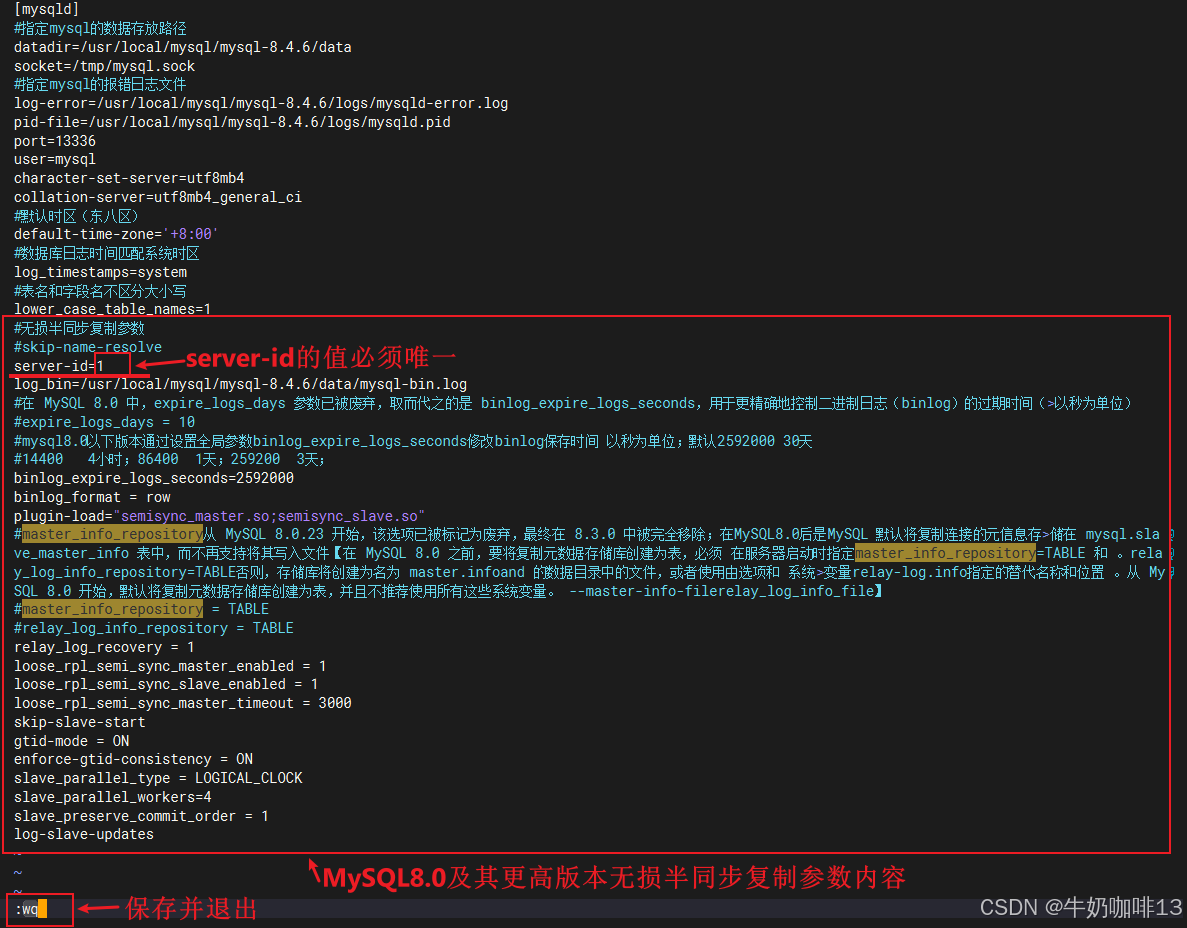 vi /usr/local/mysql/mysql-8.0.43/etc/my.cnf#无损半同步复制参数(必须确保每台服务器上的【server-id】是唯一的,不能相同!)