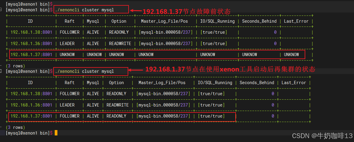 2 | 《1》如果slave节点上mysql库异常关闭,那么xenon进程会尝试重新启动,如果能够启动mysql,那么自动恢复正常。 《2》如果xenon进程无法实现重启的,那么可能是mysql本身有故障,需要检查mysql实例,修复问题,只要mysql能够正常启动,此节点就可以正常加入集群中。 |