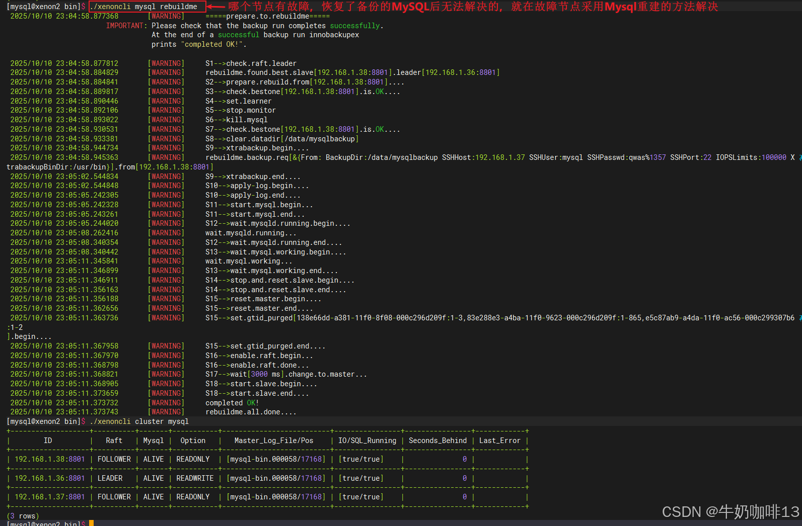 注意,在执行节点重建时,此节点的mysql服务、xenon服务需要处于启动状态,也就是说重建的节点一定是集群的成员,否则无法执行重建,因此,故障节点在恢复重建之前,最好能通过之前的mysql备份,将mysql服务启动起来。然后执行重建。