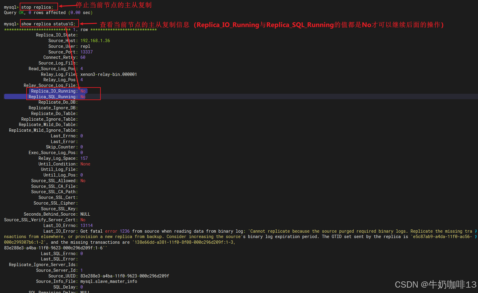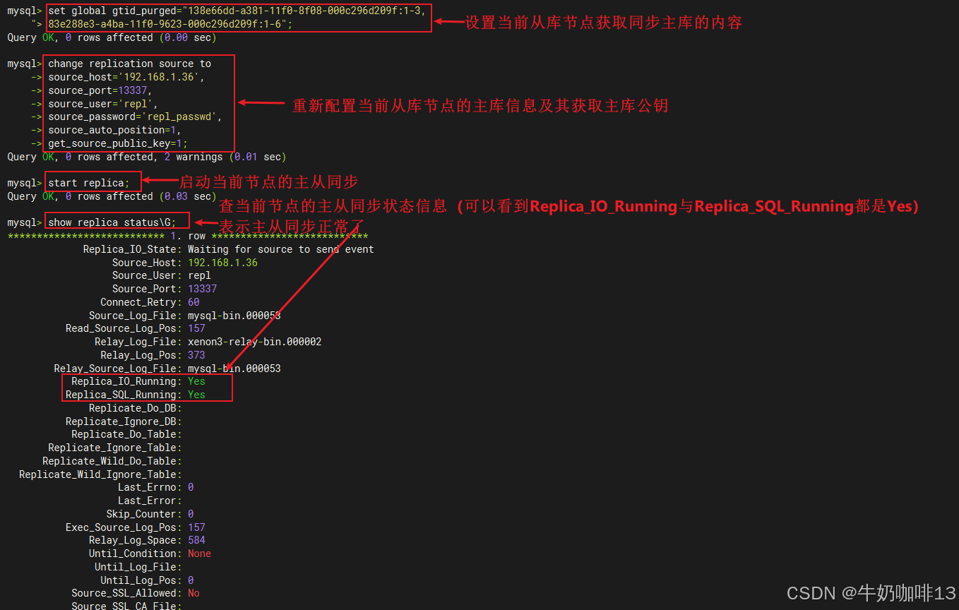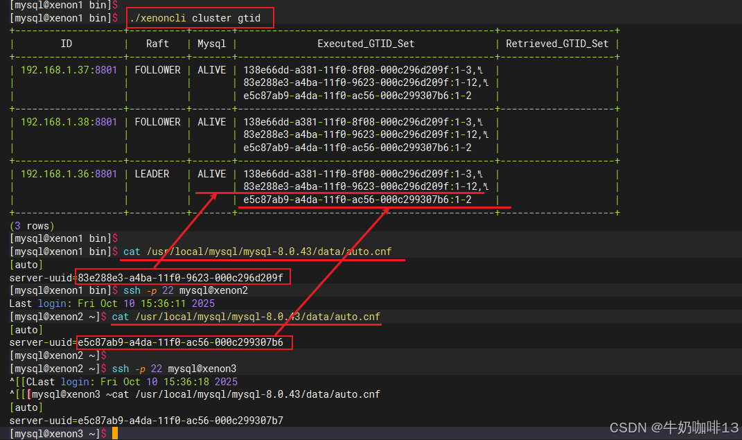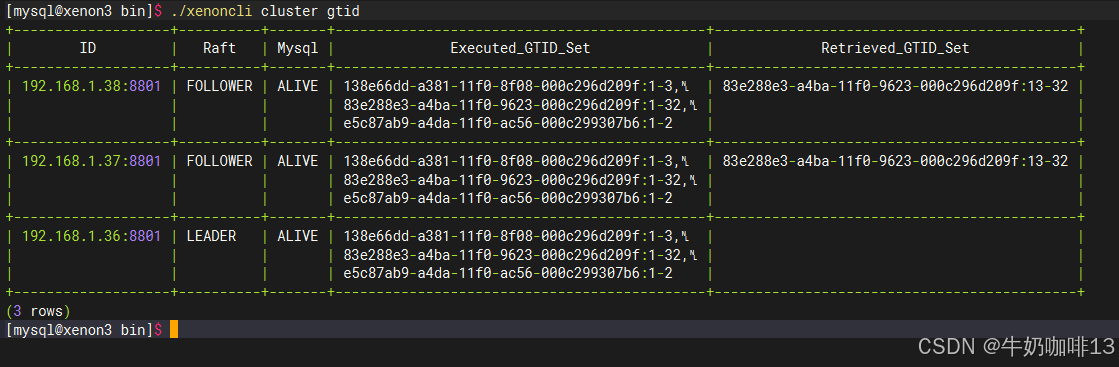 ./xenoncli cluster xenon#6-集群的主从事务同步状态【Retrieved_GTID_Set:表示从库已经接收到主库的事务编号。Executed_GTID_Set :表示从库自身已经执行的事务编号。】