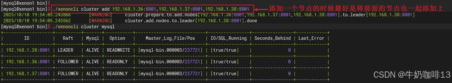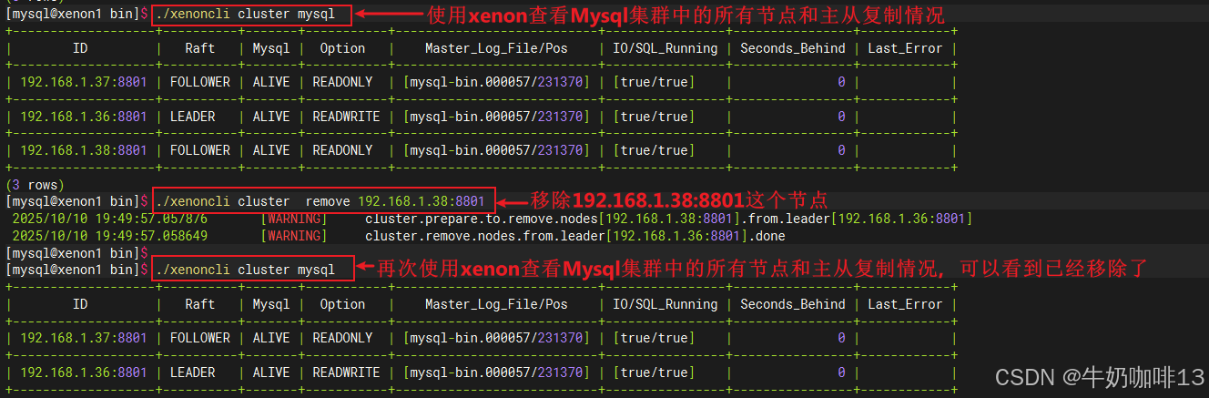 ./xenoncli cluster gtid#7-使用xenon工具添加或移除MySQL节点(注意:只能添加或移除从库,主库是无法移除的)