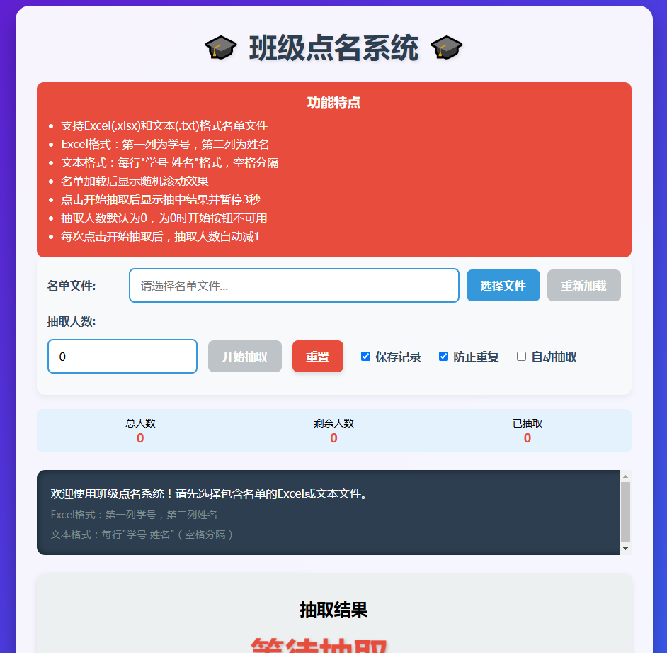 <head><meta charset="UTF-8"><meta name="viewport" content="width=device-width, initial-scale=1.0"><title>班级点名系统</title><style>* {margin: 0;padding: 0;box-sizing: border-box;font-family: 'Microsoft YaHei', sans-serif;}body {background: linear-gradient(135deg, #6a11cb 0%, #2575fc 100%);min-height: 100vh;display: flex;justify-content: center;align-items: center;padding: 20px;}.container {width: 90%;max-width: 900px;background: rgba(255, 255, 255, 0.95);border-radius: 20px;box-shadow: 0 15px 30px rgba(0, 0, 0, 0.3);padding: 30px;overflow: hidden;}h1 {text-align: center;color: #2c3e50;margin-bottom: 25px;font-size: 2.5rem;text-shadow: 2px 2px 4px rgba(0, 0, 0, 0.1);}.control-group {margin-bottom: 20px;padding: 15px;background: #f8f9fa;border-radius: 12px;box-shadow: 0 4px 8px rgba(0, 0, 0, 0.05);}.control-row {display: flex;flex-wrap: wrap;align-items: center;gap: 15px;margin-bottom: 15px;}.file-controls {display: flex;align-items: center;gap: 10px;flex: 1;}.extract-controls {display: flex;flex-wrap: wrap;align-items: center;gap: 15px;}label {font-weight: bold;color: #34495e;min-width: 100px;}input[type="text"], input[type="number"] {padding: 12px 15px;border: 2px solid #3498db;border-radius: 8px;font-size: 16px;transition: border-color 0.3s;flex: 1;}input:focus {border-color: #e74c3c;outline: none;box-shadow: 0 0 8px rgba(231, 76, 60, 0.3);}button {padding: 12px 20px;background: #3498db;color: white;border: none;border-radius: 8px;cursor: pointer;font-size: 16px;font-weight: bold;transition: all 0.3s;box-shadow: 0 4px 6px rgba(0, 0, 0, 0.1);}button:hover {background: #2980b9;transform: translateY(-2px);box-shadow: 0 6px 8px rgba(0, 0, 0, 0.15);}button:active {transform: translateY(0);}button:disabled {background: #bdc3c7;cursor: not-allowed;transform: none;box-shadow: none;}.btn-danger {background: #e74c3c;}.btn-danger:hover {background: #c0392b;}.btn-success {background: #2ecc71;}.btn-success:hover {background: #27ae60;}.checkbox-group {display: flex;align-items: center;gap: 8px;margin-left: 10px;}.process-container {background: #2c3e50;color: white;padding: 20px;border-radius: 12px;margin: 25px 0;height: 120px;overflow-y: auto;box-shadow: inset 0 0 10px rgba(0, 0, 0, 0.5);font-family: 'Courier New', monospace;line-height: 1.6;}.result-container {background: #ecf0f1;padding: 25px;border-radius: 12px;text-align: center;min-height: 200px;display: flex;flex-direction: column;justify-content: center;align-items: center;box-shadow: 0 4px 8px rgba(0, 0, 0, 0.1);position: relative;}.winner {font-size: 3rem;color: #e74c3c;font-weight: bold;text-shadow: 2px 2px 4px rgba(0, 0, 0, 0.2);margin: 15px 0;animation: pulse 1.5s infinite;transition: all 0.5s ease;}.winner.scrolling {animation: none;transform: scale(1.1);color: #3498db;}@keyframes pulse {0% { transform: scale(1); }50% { transform: scale(1.05); }100% { transform: scale(1); }}.student-info {font-size: 1.2rem;margin-top: 5px;color: #3498db;transition: all 0.5s ease;}.student-info.scrolling {color: #e74c3c;}.history-title {margin-top: 25px;color: #2c3e50;font-size: 1.5rem;text-align: center;}.history-list {max-height: 200px;overflow-y: auto;padding: 15px;background: #f8f9fa;border-radius: 12px;margin-top: 10px;box-shadow: inset 0 0 5px rgba(0, 0, 0, 0.1);}.history-item {padding: 10px;border-bottom: 1px dashed #ddd;}.history-item:last-child {border-bottom: none;}.instructions {background: #f1c40f;color: #2c3e50;padding: 15px;border-radius: 10px;margin-top: 25px;font-size: 0.9rem;}.feature-highlight {background: #e74c3c;color: white;padding: 15px;border-radius: 10px;margin-top: 20px;}.feature-highlight h3 {margin-bottom: 10px;text-align: center;}.feature-highlight ul {padding-left: 20px;}.feature-highlight li {margin-bottom: 5px;}.file-input-wrapper {position: relative;display: inline-block;overflow: hidden;}.file-input-wrapper input[type="file"] {position: absolute;left: 0;top: 0;opacity: 0;cursor: pointer;height: 100%;width: 100%;}.status-bar {display: flex;justify-content: space-between;margin-top: 15px;padding: 10px;background: #e3f2fd;border-radius: 8px;font-size: 14px;}.status-item {display: flex;flex-direction: column;align-items: center;flex: 1;}.status-value {font-weight: bold;font-size: 1.2em;color: #e74c3c;}.file-info {font-size: 0.9em;color: #7f8c8d;margin-top: 5px;}</style>