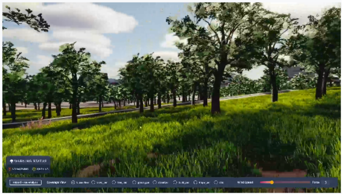 构建大规模城市及树木孪生,精确数字化呈现城市肌理与众多树木个体,并支持单体树木的精细化展示。基于此孪生模型进行城市尺度的风场动态模拟,同时,平台具备热力区域分析能力,赋能城市规划、树木管理、环境监测与应急响应。