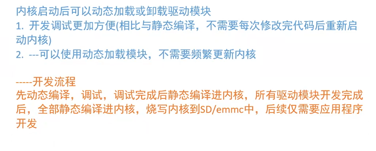 - 开发流程通常为:先动态编译进行调试,完成后转为静态编译集成到内核。