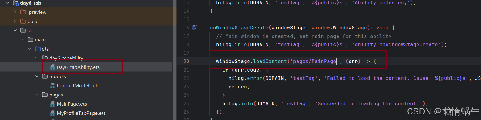 然后把day6_tab模块src/main/ets/day6_tabability/Day6_tabAbility.ets中的loadContent修改成MainPage。