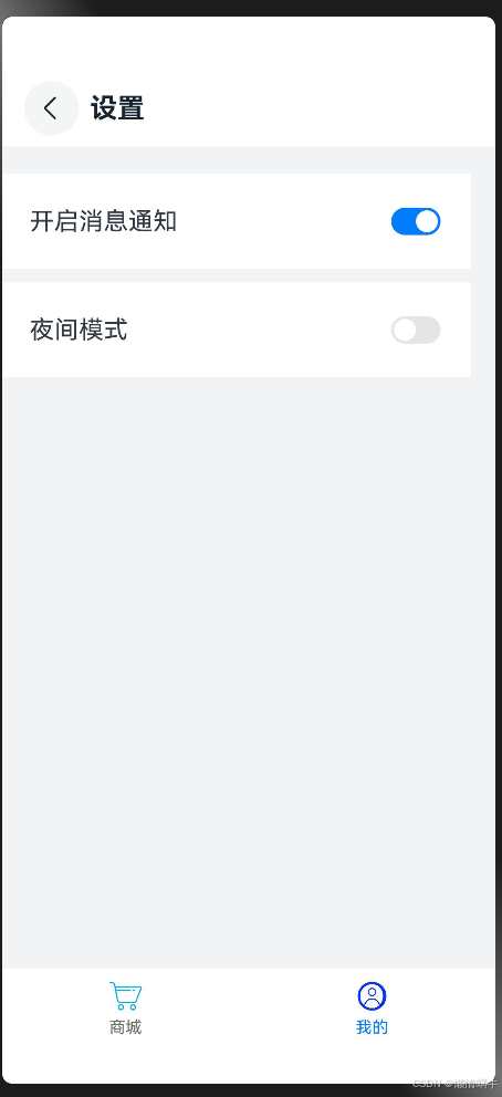@Componentexport struct SettingsPage {@State isNotificationOn: boolean = true;@State isDarkMode: boolean = false;build() {Column() {List({ space: 10 }) {ListItem() {Row() {Text('开启消息通知').fontSize(18)Toggle({ type: ToggleType.Switch, isOn: this.isNotificationOn }).onChange((isOn) => {this.isNotificationOn = isOn;})}.width('100%').justifyContent(FlexAlign.SpaceBetween).padding(20).backgroundColor(Color.White)}.borderRadius(15)ListItem() {Row() {Text('夜间模式').fontSize(18)Toggle({ type: ToggleType.Switch, isOn: this.isDarkMode }).onChange((isOn) => {this.isDarkMode = isOn;})}.width('100%').justifyContent(FlexAlign.SpaceBetween).padding(20).backgroundColor(Color.White)}.borderRadius(15)}.width('95%').margin({top: 20})}.width('100%').height('100%').backgroundColor('#f1f3f5').alignItems(HorizontalAlign.Start)}}