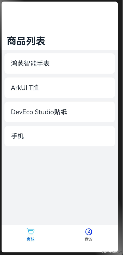@Entry@Componentstruct MainPage {@State currentIndex: number = 0@Builderprivate tabBuilder(title: string, targetIndex: number, icon: Resource) {Column() {Image(icon).width(28).height(28).margin({ bottom: 2 })Text(title).fontSize(12).fontColor(this.currentIndex === targetIndex ? '#007DFF' : '#666666')}.width('100%').height('100%').justifyContent(FlexAlign.Center)}build() {Tabs({ barPosition: BarPosition.End }) {TabContent() {ProductListPage()}.tabBar(this.tabBuilder('商城', 0, $r('app.media.ic_shop')))TabContent() {MyProfileTabPage()}.tabBar(this.tabBuilder('我的', 1, $r('app.media.ic_profile')))}.onChange((index) => {this.currentIndex = index;}).animationDuration(300).barWidth('100%').barHeight(56)}}