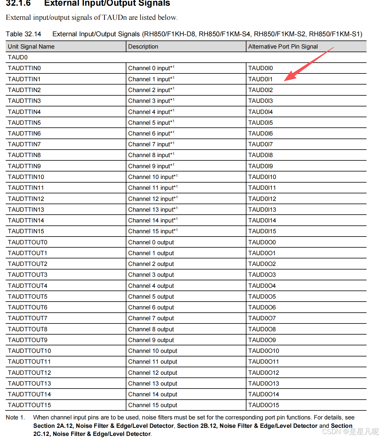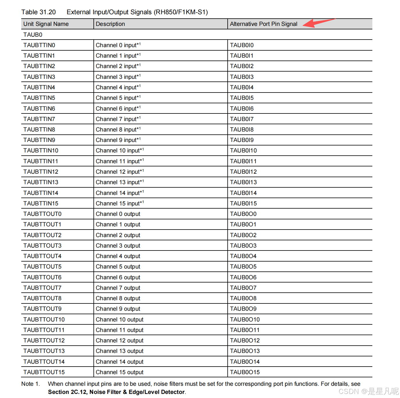 在100pin的MCU中,有一个TAUB定时器,称为TAUB0,并且一个定时器带有16个channel。每一个channel既可以作为输出也可以作为输入,对于简称可以看第三张图片,比如TAUB0I1代表TAUB0的第2个输入通道。