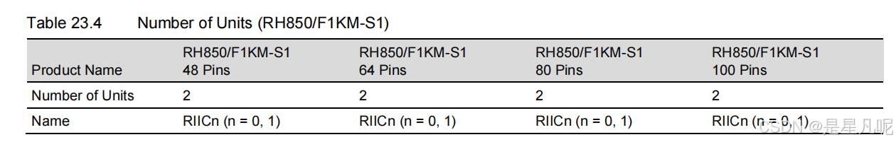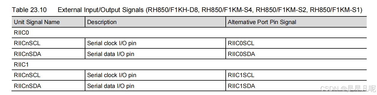 如下所示,F1KMS1_100pin有两个RIIC模块,RIIC0与RIIC1。端口上面的标识名称为RIIC0SCL / RIIC0SDA