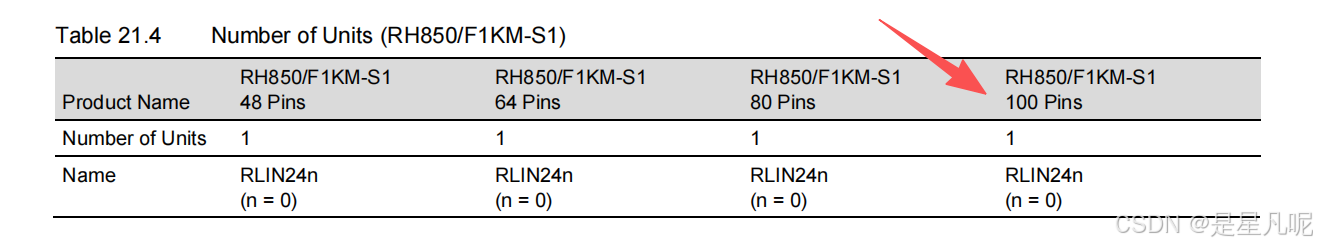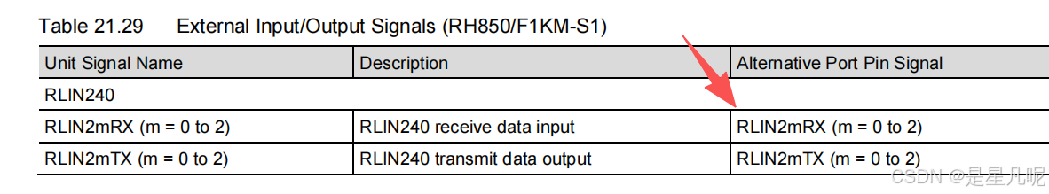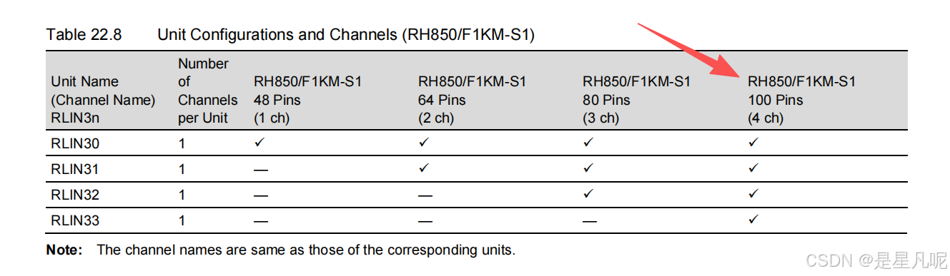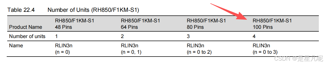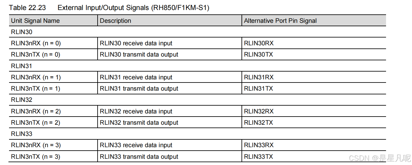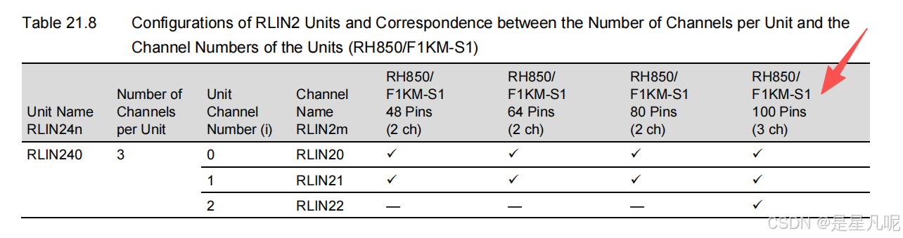 对于RH850F1KMS1而言,RLIN2只能作为主机。其有一个模块RLIN240,三个LIN通道RLIN20~RLIN22,端口上面的标识名称为RLIN20RX / RLIN20TX。