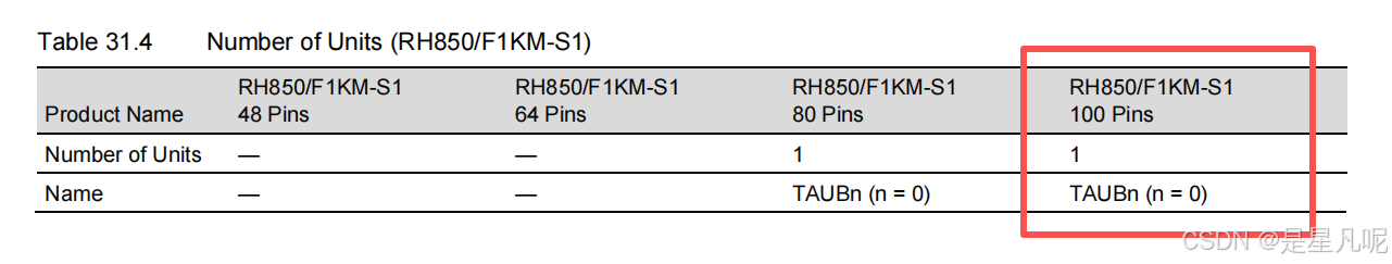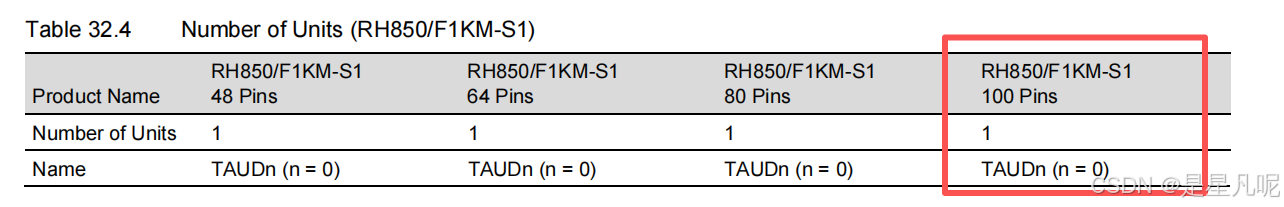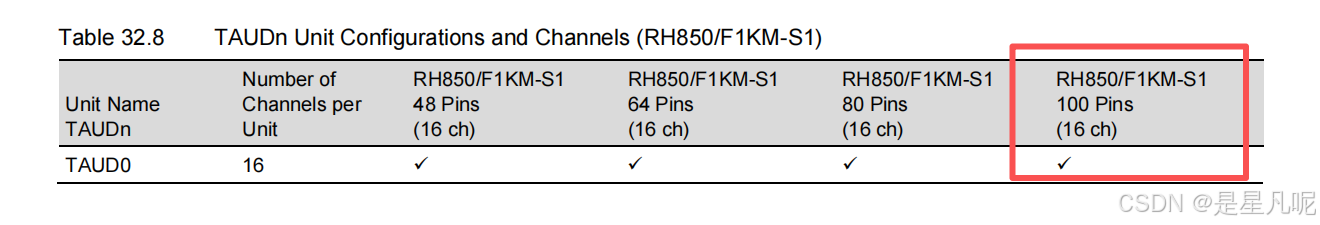在100pin的MCU中,同样的,也只有一个TAUD定时器,称为TAUD0,并且一个定时器带有16个channel。每一个channel既可以作为输出也可以作为输入