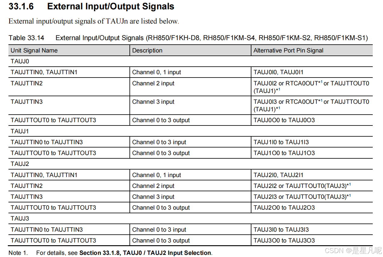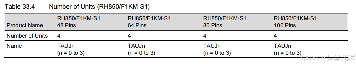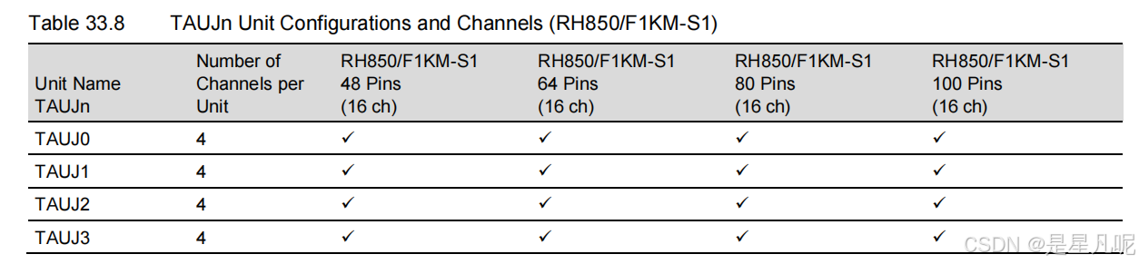 在100pin的MCU中,有4个TAUJ定时器,称为TAUJ0~3,并且一个定时器带有4个channel。每一个channel既可以作为输出也可以作为输入