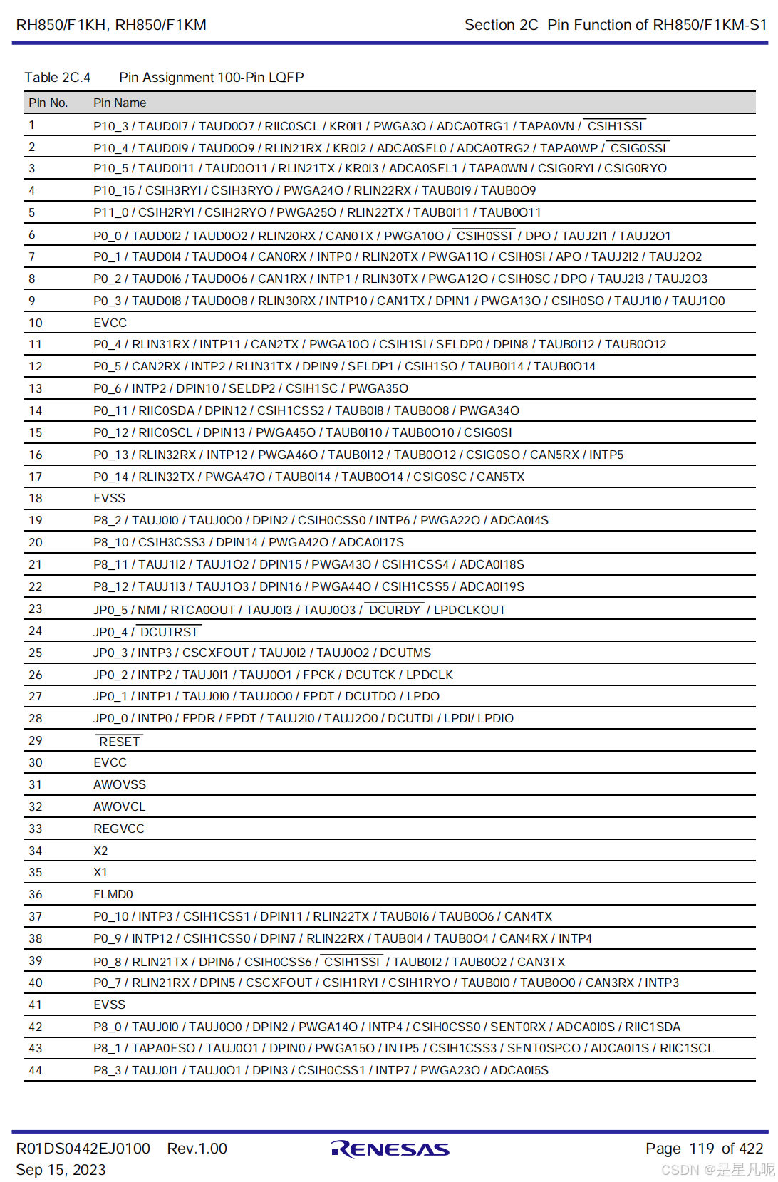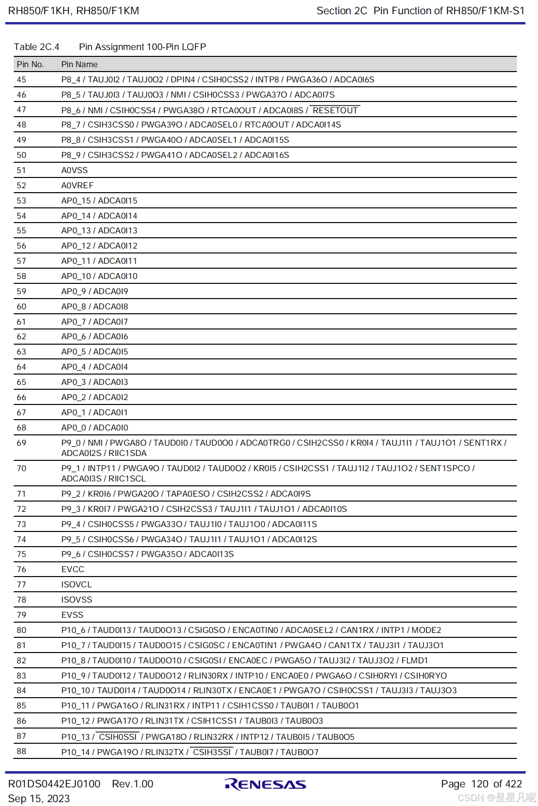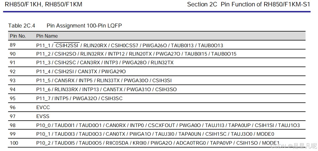 这里就以瑞萨芯片中非常常见的车规级MCU RH850F1KMS1为例结合数据手册上面的标识说明一下这里面所标的名称代表的意思。如下是数据手册里面100Pin的各个引脚的复用功能。当然这些外设可以将之悉数列出,并可以清晰地知晓是哪一路以及不同的数字标号是代表的什么意思。