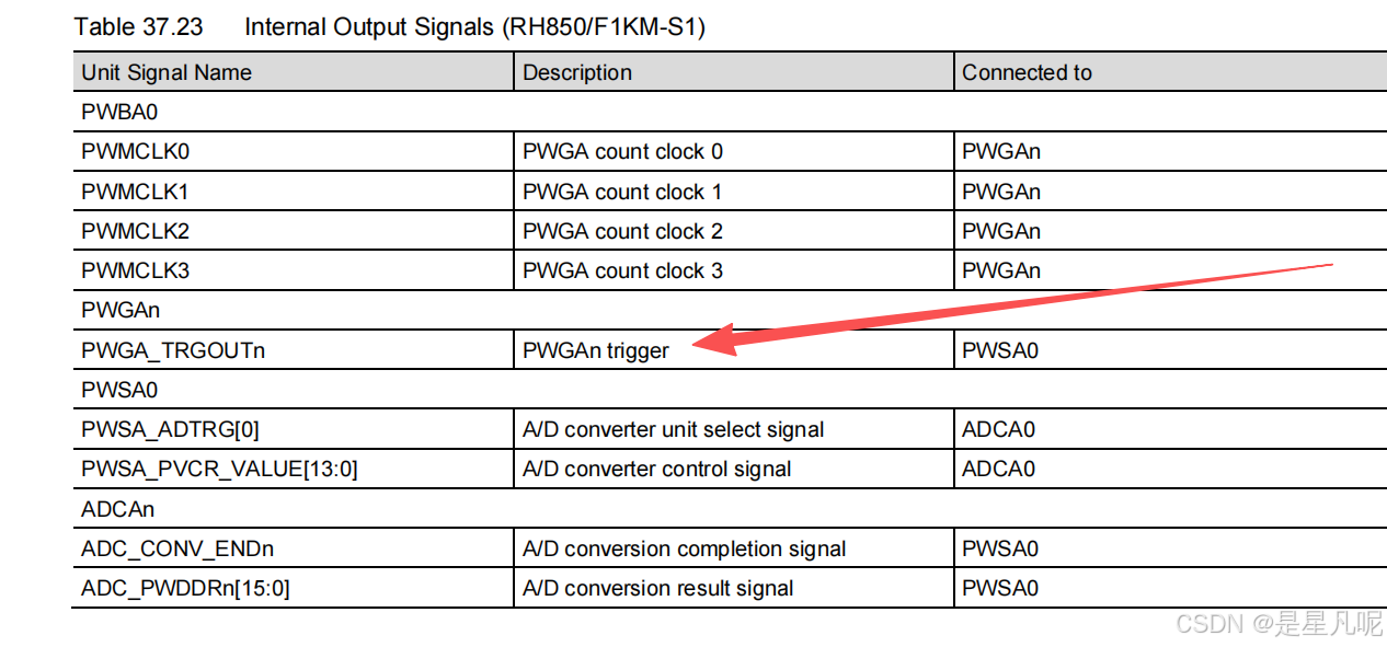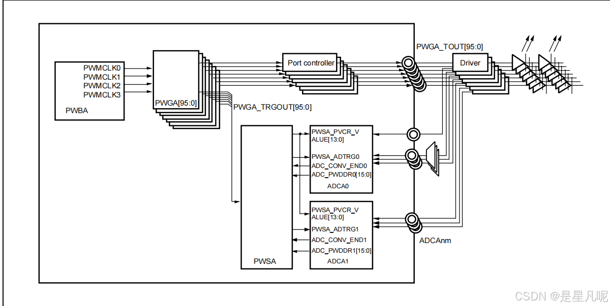 对于PWBA与PWSA而言,PWBA作用是将PCLK分频并提供给PWGA计数时钟信号,PWSA向A/D转换器发送所需的设置信息,并输出A/D转换启动触发器,ADCA完成A/D转换之后再将信息反馈给PWSA,之后模数转换触发PWGA_TRGOUTn输出进行波形输出。