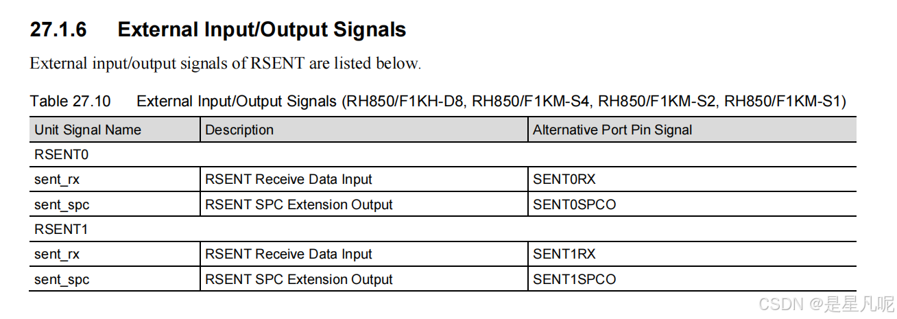 比如SENT1RX、SENT1SPC0等表示串行传感器接口接收与发送引脚,常用于传感器数据通信。
