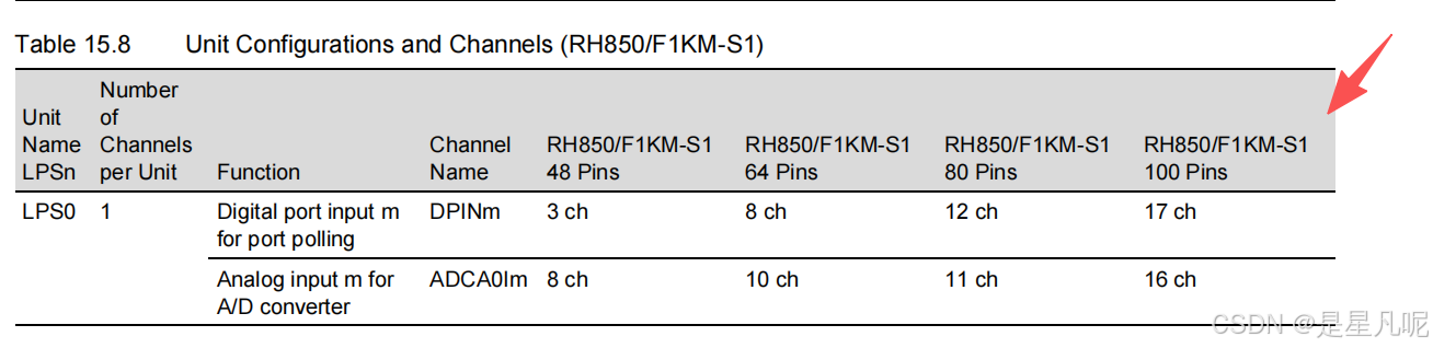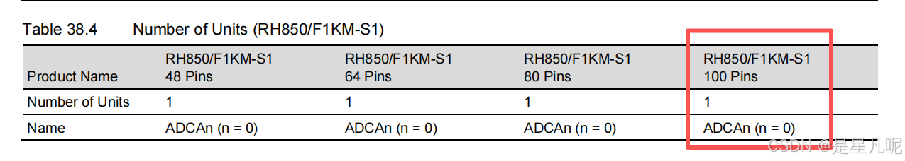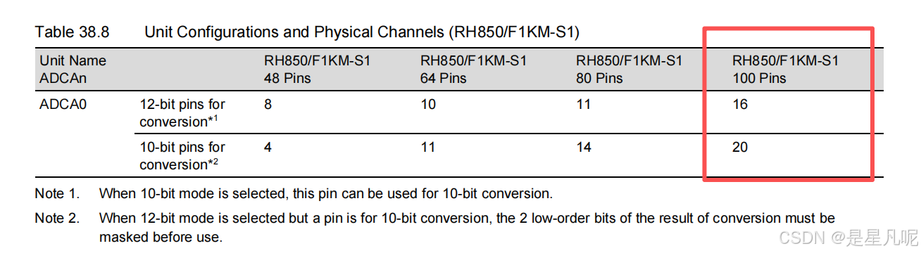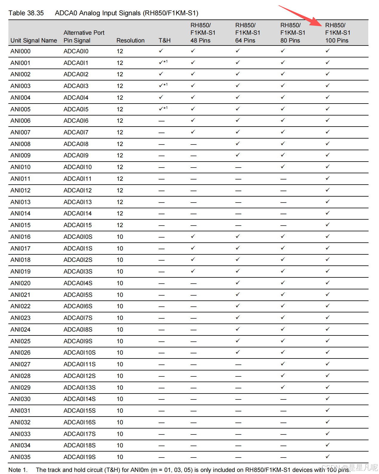 如下参数考手册所示,F1KMS1_100PIN有一个ADCA转换器,即ADCA0,其中12bit的有16channel,10bit的有20 channel,一共有36个转换通道。例如ADCA0I10S就代表是10bit的ADCA0的第10个通道。