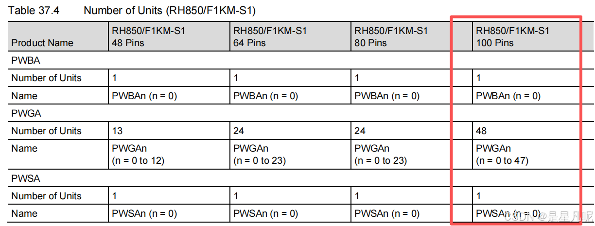 F1KMS1_100PIN有48个PWM输出通道,PWGA0~47,例如PWGA0O代表的是第一路的PWM输出引脚