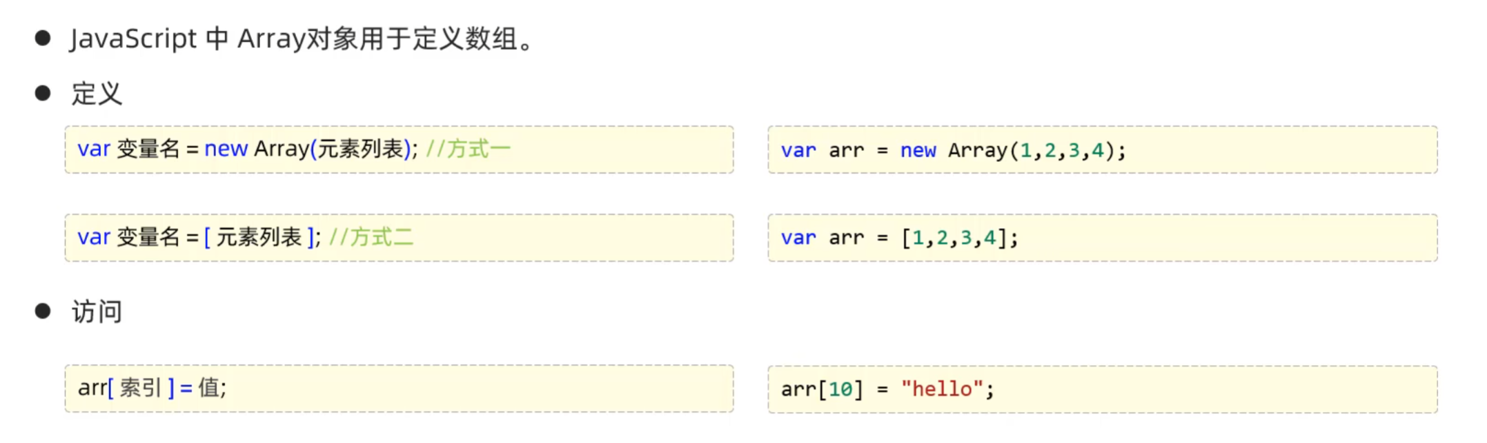 注:JavaScript中的数组相当于Java中的集合,数组的长度是可变的,而JavaScript是弱类型,所以可以存储任意类型的数据。