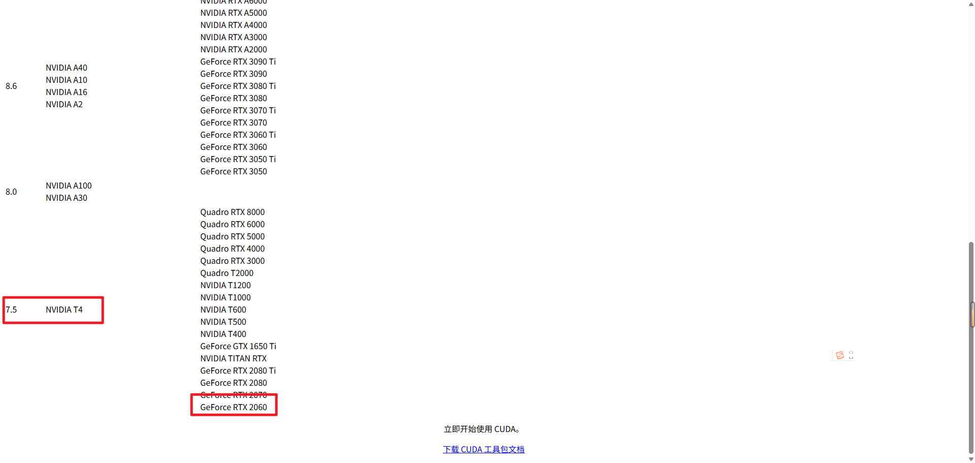 2. 打开网址 https://developer.nvidia.cn/cuda-gpus#compute 对照着查看GPU的计算能力,大家对照看自己的即可。