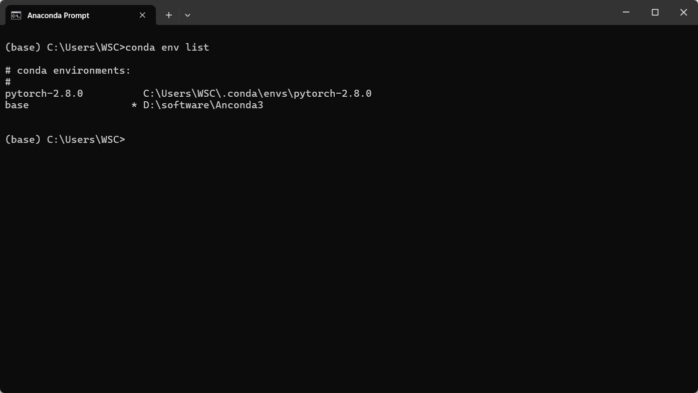 发现我有两个环境,一个是Anonda的base环境,一个是我基于base环境所创建的名称为 Pytorch-2.8.0 的独立的虚拟环境。