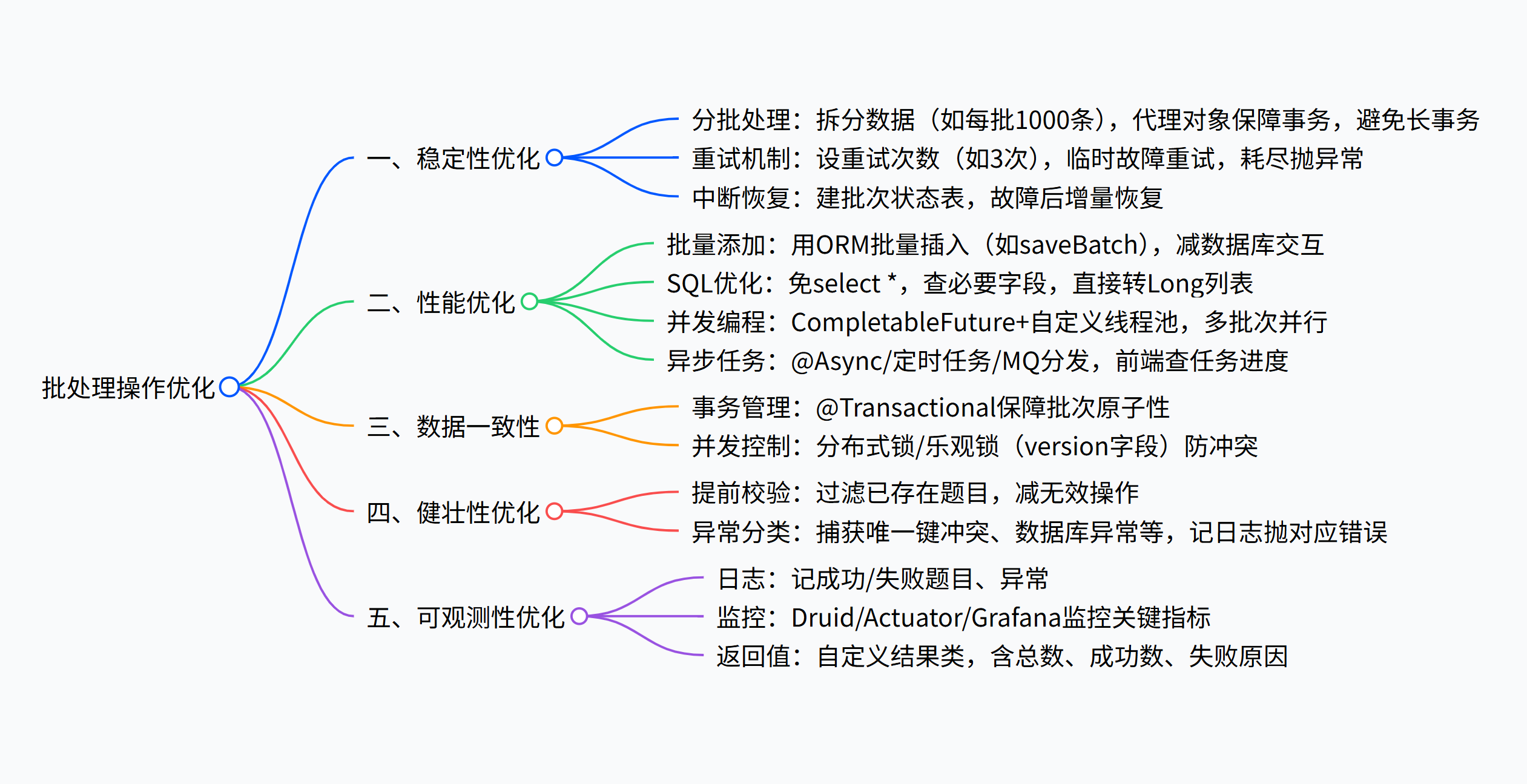 如果在批量插入过程中由于某种原因(如数据库宕机、服务器重启)导致批处理中断,建议设计一种机制来进行 增量恢复。比如可以为每次操作打上批次标记,在操作未完成时记录操作状态(如部分题目成功添加),并在恢复时继续执行未完成的操作。