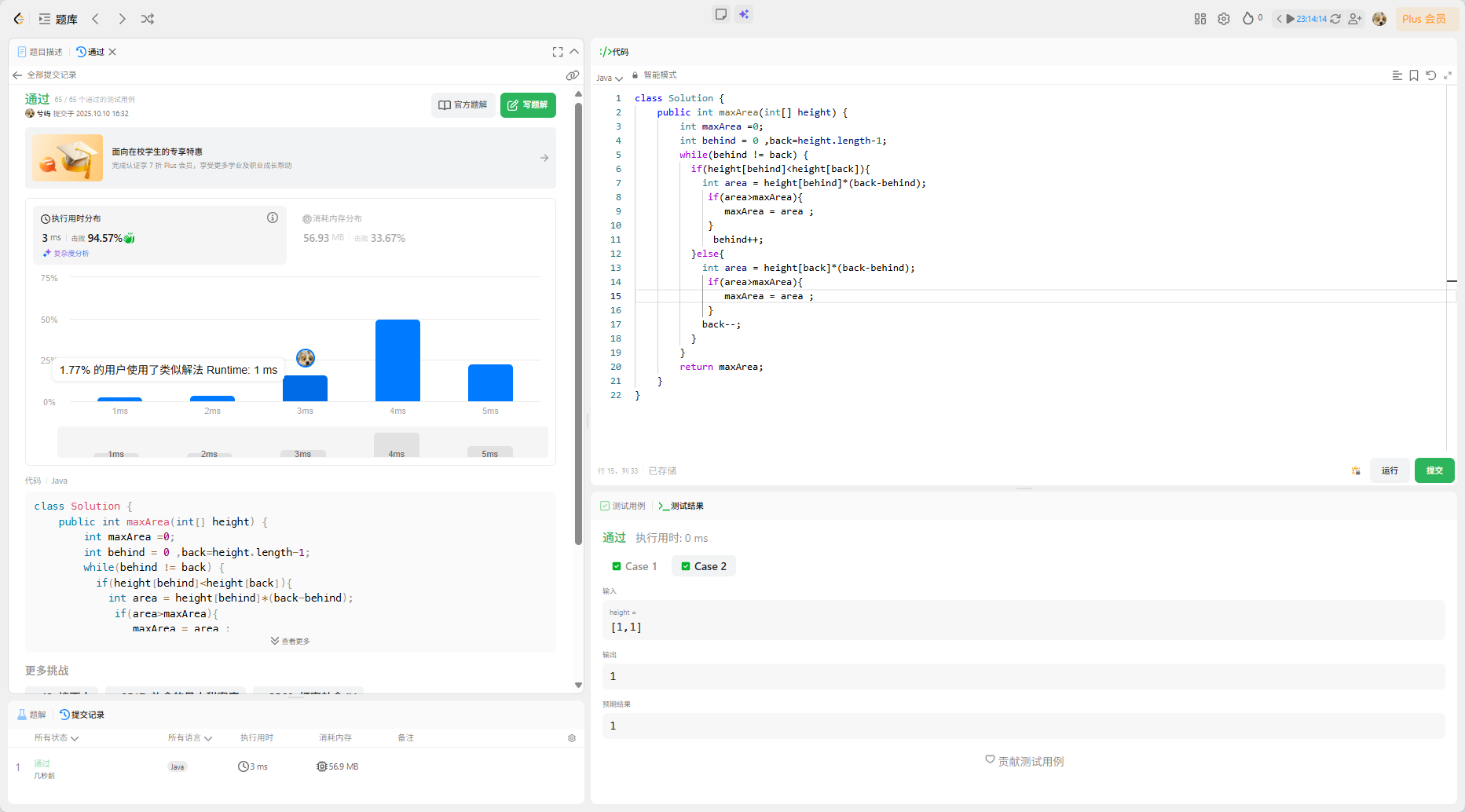 class Solution {public int maxArea(int[] height) {int maxArea =0;int behind = 0 ,back=height.length-1;while(behind != back) {if(height[behind]<height[back]){int area = height[behind]*(back-behind);if(area>maxArea){maxArea = area ;}behind++;}else{int area = height[back]*(back-behind);if(area>maxArea){maxArea = area ;}back--;}}return maxArea;}