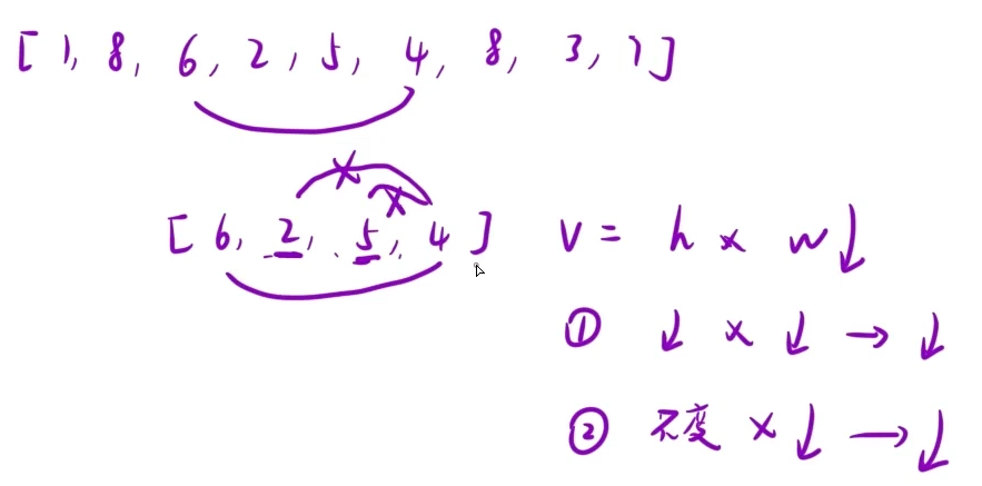 如果你的总体积是减小的 我要的是盛水最多的容器 那么中间2 和 5 就不需要枚举了