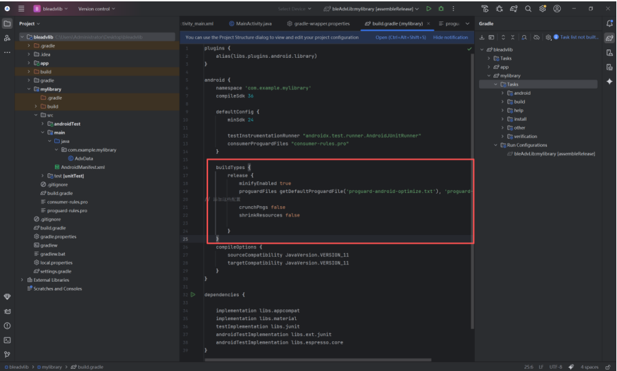 要生成混淆的库,minifyEnabled需要设为true,最下面2项的false也必须要。