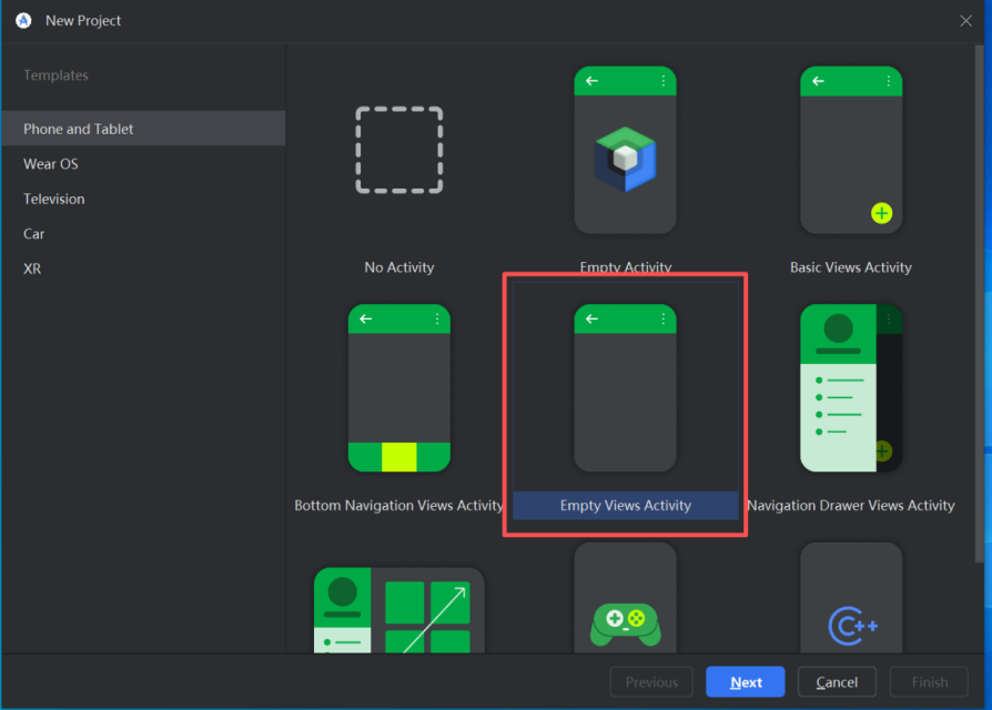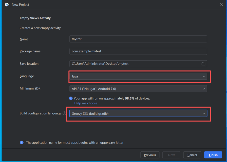 创建第一个工程,这里要注意,最新版是默认使用kolin语言,对使用java的很不友好。按下图选,创建,可以使用java编程。