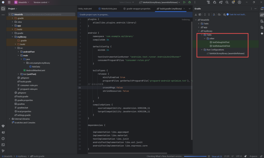 设置好以后,选中右边gradle栏中的mylibray-->task-->other-->assemble release(如果选的debug是不会混淆的)。