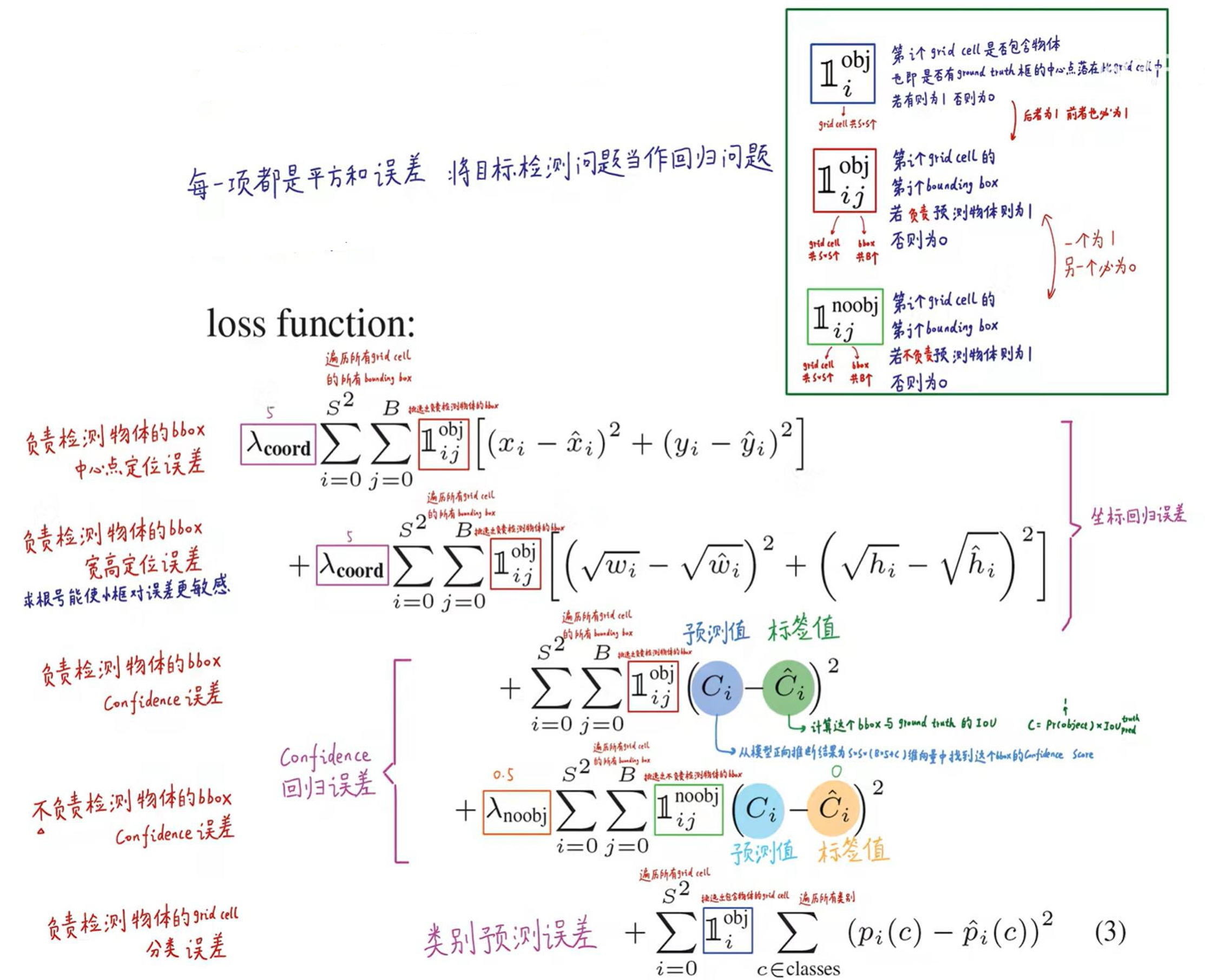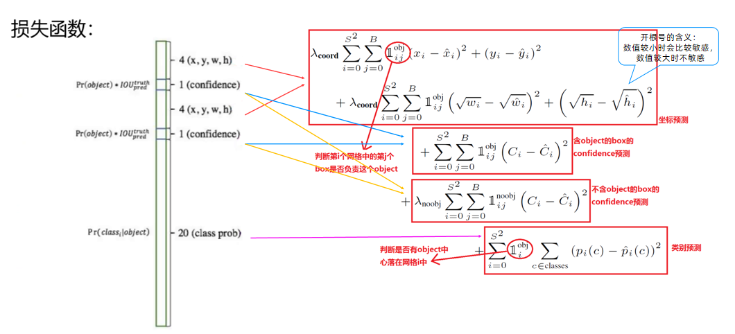 前面的求和符号s平方表示网格的格式,例如YOLO v1中的网格个数为7*7,然后B表示预选框的个数,此处数值为2,后面的x表示预选框的中心点的坐标x,y,以及预选框的宽w、高h。