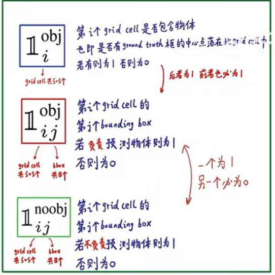 第二个红框内的符号表示第i个网格的第j个预选框,如果负责预测物体,那么整体的值为1,反之为0