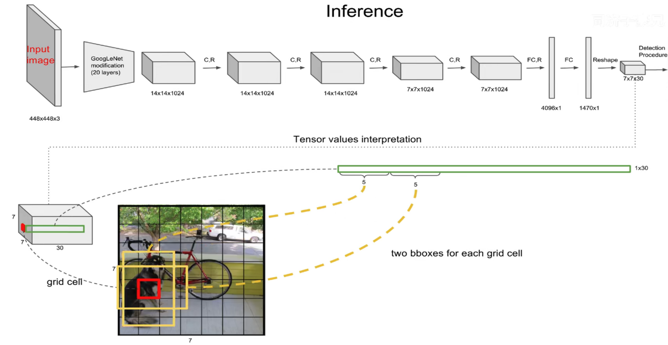 每个grid有30维,这30维中,8维是回归box的坐标,2个B是box的confidence,还有20维是类别。 其中坐标的x,y(相对于网格单元格边界的框的中心)用对应网格的归一化到0-1之间,w,h用图像的width和height归一化到0-1之间。