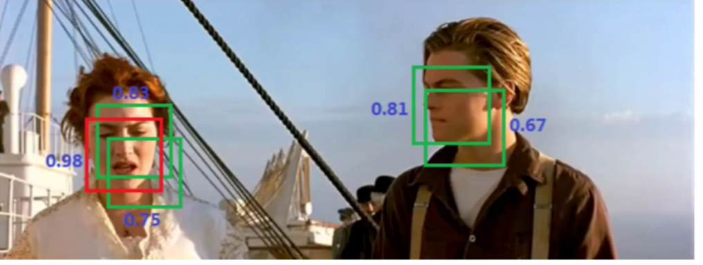 例如上图中,同一个人脸被多个预选框预测出来,导致了预选框的重叠,此时可以将置信度低的抑制了,只保留最大的那个。