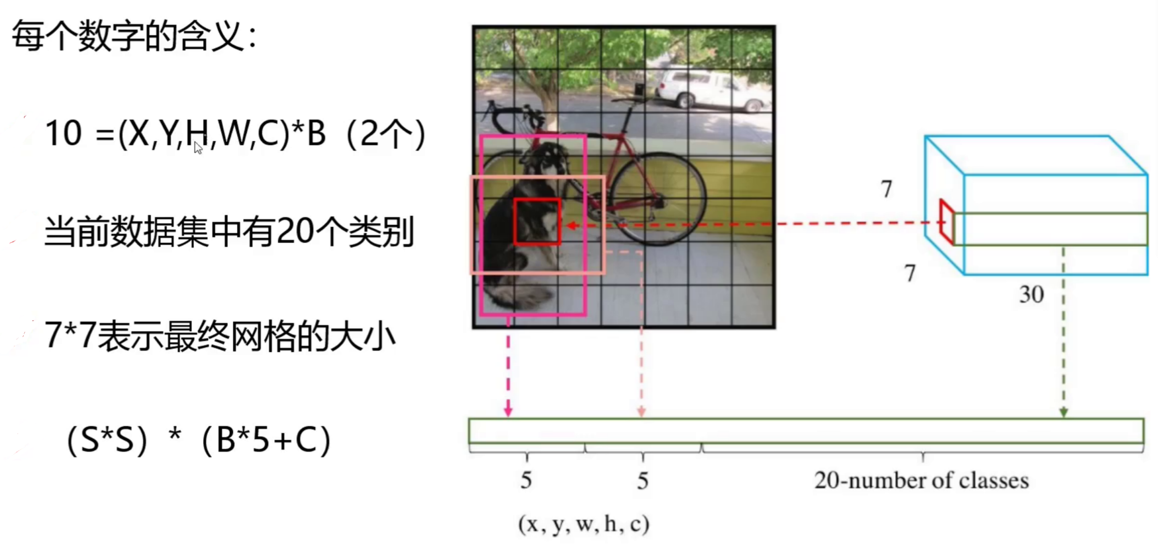 30表示每个网格内的30个预测信息,包括20个类别概率(以PASCAL VOC数据集为例,该数据集共20个类别)、2个预选框(bounding box)及其置信度(每个边界框包含中心点坐标x、y,宽度w、高度h以及一个置信度分数)。