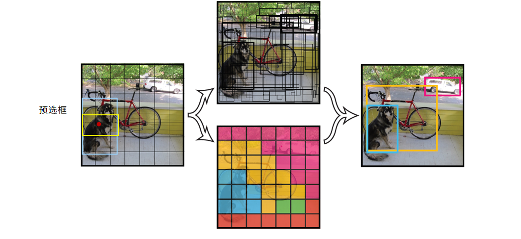 核心思想:将一幅图像分成SxS个网格(grid cell),如果某个object的中心 落在这个网格中,则这个网格就负责预测这个object。