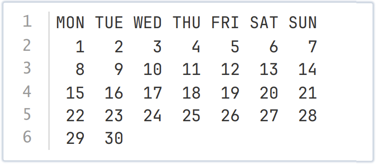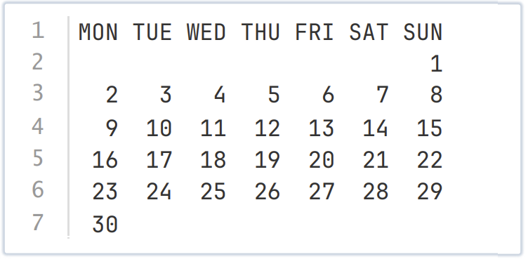 小A想制作2025年每个月的日历。他希望你能编写一个程序,按照格式输出给定月份的日历。具体来说,第一行需要输出 MON TUE WED THU FRI SAT SUN ,分别表示星期一到星期日。接下来若干行中依次输出这个月所包含的日期,日期的个位需要和对应星期几的缩写最后一个字母对齐。例如,2025 年 9 月 1 日是星期 一,在输出九月的日历时,1号的个位 1 就需要与星期一 MON 的最后一个字母 N 对齐。九月的日历输出效果如下: