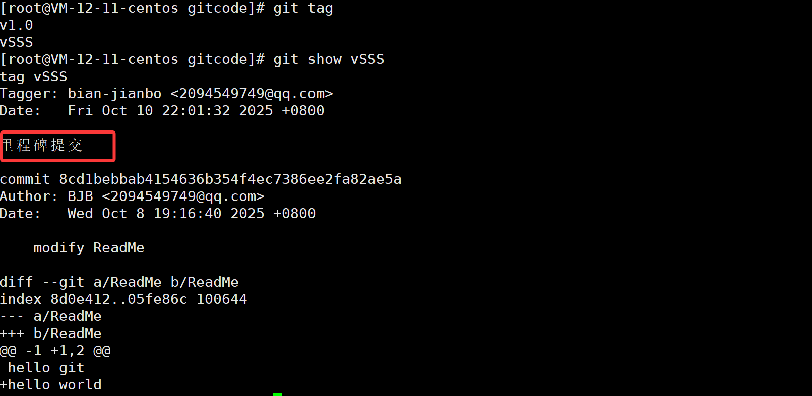 这样的话看不到标签的说明文字,可以使用 git show [tagname] 查看到: