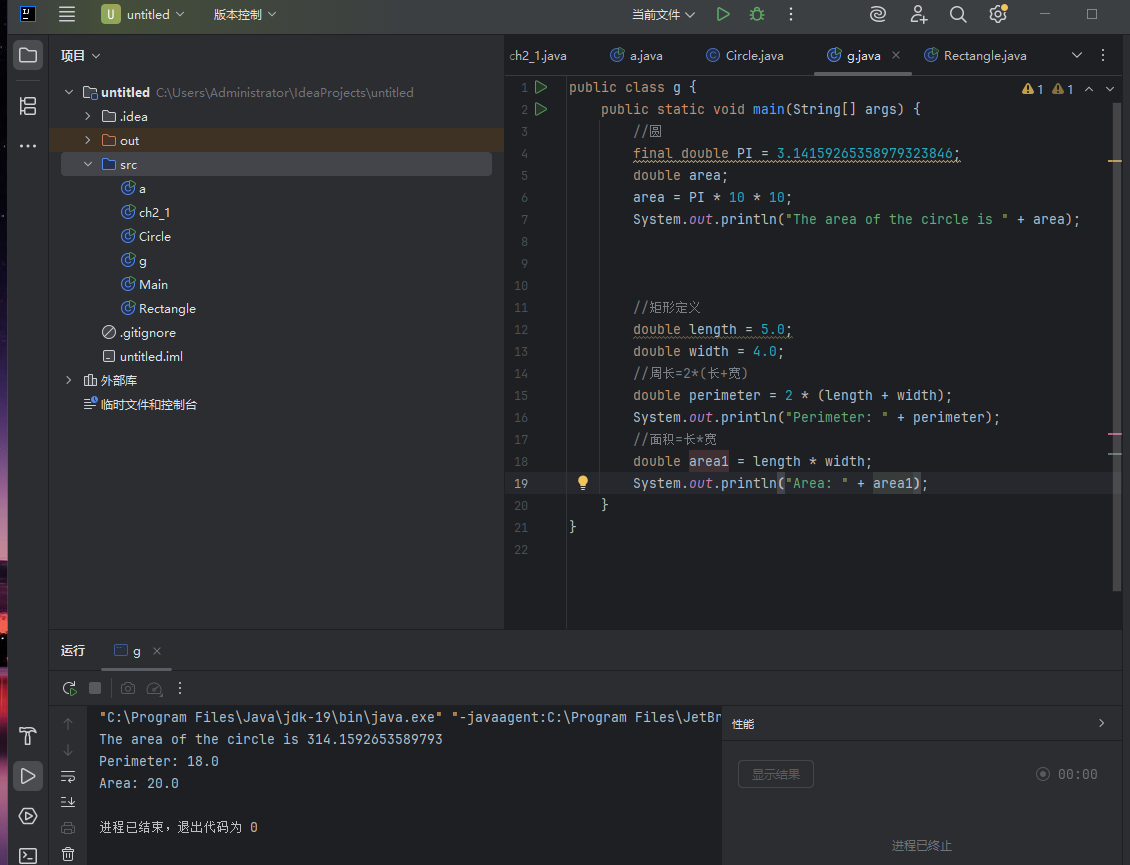 public class g {public static void main(String[] args) {//圆final double PI = 3.14159265358979323846;double area;area = PI * 10 * 10;System.out.println("The area of the circle is " + area);//矩形定义double length = 5.0;double width = 4.0;//周长=2*(长+宽)double perimeter = 2 * (length + width);System.out.println("Perimeter: " + perimeter);//面积=长*宽double area1 = length * width;System.out.println("Area: " + area1);}