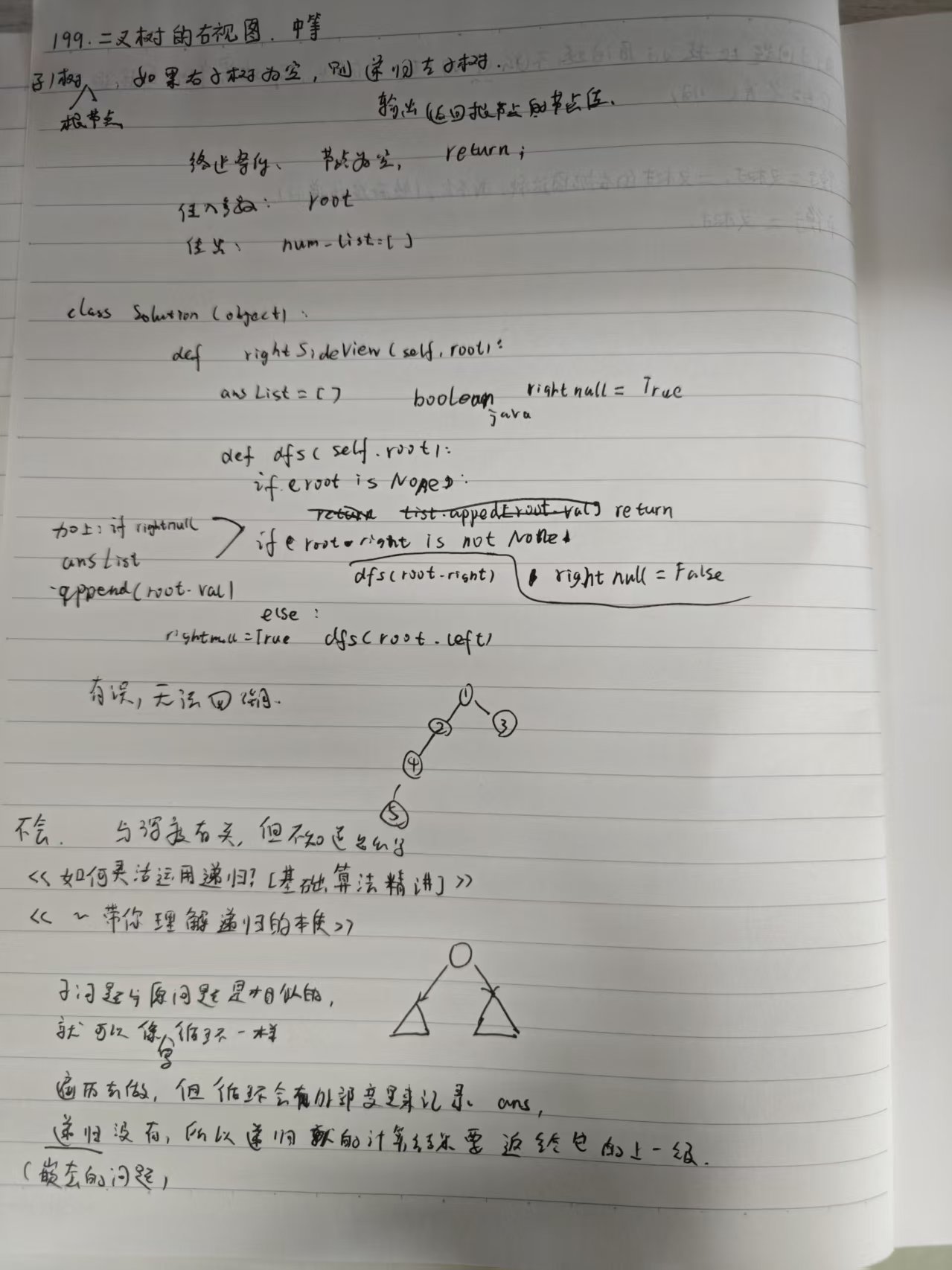 class Solution(object):def rightSideView(self, root):""":type root: Optional[TreeNode]:rtype: List[int]"""#先递归右子树,问题:怎么记录答案,怎么确定当前节点是否要记录到答案中去#记录当前递归深度,如果当前递归深度与当前答案长度一致,则将当前节点加入到答案中。否则不加入。ans = []def dfs(root,height):if root is None:return if height == len(ans):ans.append(root.val)dfs(root.right,height+1)dfs(root.left,height+1)dfs(root,0)return ans