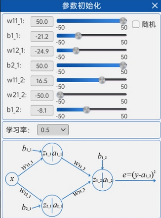 了解了全连接神经网络中的前向计算过程后,就可以进行前向计算了。首先要进行的就是参数初始化,在“参数初始化”组件中,可以修改神经网络计算过程中所涉及到的参数以及后续反向传播更新参数用到的学习率,并且随着参数的修改,原本的直线会随着参数的修改而改变形状。如下图所示: