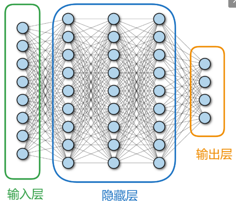 全连接神经网络通常包括输入层、隐藏层、输出层三层核心结构,每层由若干节点(神经元)组成,且层间节点全连接。如下图所示:
