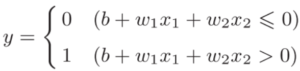 其中b称为偏置,w1和w2称为权重。感知机 会计算输入信号和权重的乘积,然后加上偏置,如果这个值大于0则输出1,否则输出0。