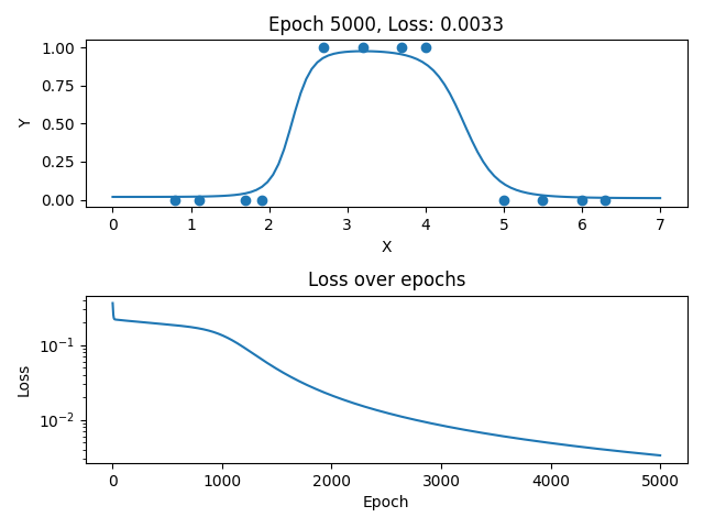 for epoch in range(1, epoches + 1):# 前向传播计算输出和损失a1_1, a2_1, a1_2 = forward(w11_1, b1_1, w12_1, b2_1, w11_2, w21_2, b1_2, X)loss = loss_func(Y, a1_2)loss_list.append(loss)epoches_list.append(epoch)# 反向传播计算梯度# 输出层梯度计算deda1_2 = -2 * (Y - a1_2) # 损失对输出层输出的导数dedz1_2 = deda1_2 * a1_2 * (1 - a1_2) # 损失对输出层输入的导数# 输出层权重和偏置的梯度dedw11_2 = np.mean(dedz1_2 * a1_1)dedw21_2 = np.mean(dedz1_2 * a2_1)dedb1_2 = np.mean(dedz1_2)# 隐藏层梯度计算deda1_1 = dedz1_2 * w11_2 # 损失对隐藏层第一个神经元输出的导数dedz1_1 = deda1_1 * a1_1 * (1 - a1_1) # 损失对隐藏层第一个神经元输入的导数# 隐藏层第一个神经元的权重和偏置的梯度dedw11_1 = np.mean(dedz1_1 * X)dedb1_1 = np.mean(dedz1_1)# 隐藏层第二个神经元的梯度计算deda2_1 = dedz1_2 * w21_2 # 损失对隐藏层第二个神经元输出的导数dedz2_1 = deda2_1 * a2_1 * (1 - a2_1) # 损失对隐藏层第二个神经元输入的导数# 隐藏层第二个神经元的权重和偏置的梯度dedw12_1 = np.mean(dedz2_1 * X)dedb2_1 = np.mean(dedz2_1)# 梯度下降更新参数w11_2 = w11_2 - lr * dedw11_2w21_2 = w21_2 - lr * dedw21_2b1_2 = b1_2 - lr * dedb1_2w11_1 = w11_1 - lr * dedw11_1b1_1 = b1_1 - lr * dedb1_1w12_1 = w12_1 - lr * dedw12_1b2_1 = b2_1 - lr * dedb2_1"""反向传播过程:计算损失函数对输出层输出的导数计算损失函数对输出层输入的导数(使用链式法则)计算输出层权重和偏置的梯度计算隐藏层神经元的梯度(继续使用链式法则)计算隐藏层权重和偏置的梯度使用梯度下降法更新所有参数"""# 7.显示频率设置if epoch == 1 or epoch % 100 == 0:print(f"epoch:{epoch},loss:{loss}")# 画图 散点图及预测曲线# 清除当前图形plt.clf()plt.subplot(2, 1, 1)# 画Y的散点和拟合线a1_1, a2_1, a1_2 = forward(w11_1, b1_1, w12_1, b2_1, w11_2, w21_2, b1_2, x_values)plt.plot(x_values, a1_2)# 画散点plt.scatter(X, Y)plt.title(f'Epoch {epoch}, Loss: {loss:.4f}')plt.xlabel('X')plt.ylabel('Y')# 画损失值plt.subplot(2, 1, 2)plt.plot(epoches_list, loss_list)plt.title('Loss over epochs')plt.xlabel('Epoch')plt.ylabel('Loss')plt.yscale('log') # 使用对数刻度更好地观察损失变化plt.tight_layout()plt.pause(0.1)# 8.梯度下降显示