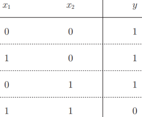 与非门就是颠倒了与门的输出,当且仅当两个输入均为 1 时输出 0,否则输出1,其真值表如下图所示。