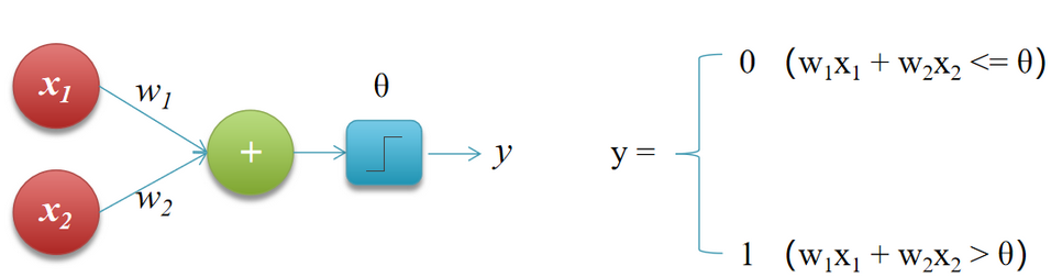 接收两个输入信号的感知机中,输入信号 x1、x2 经权重 w1、w2 加权后求和,若总和超过阈值 θ,神经元激活并输出 1,否则输出 0,其中权重反映信号重要性,θ 为激活界限值。如下图所示。